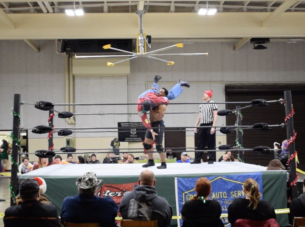 “The Babushka Baron” Jeffrey John defeated Tyler Grayson in a Wreck the Halls falls count anywhere match to retain the Route 33 Open Weight Championship, finishing Grayson with an Attitude Adjustment.