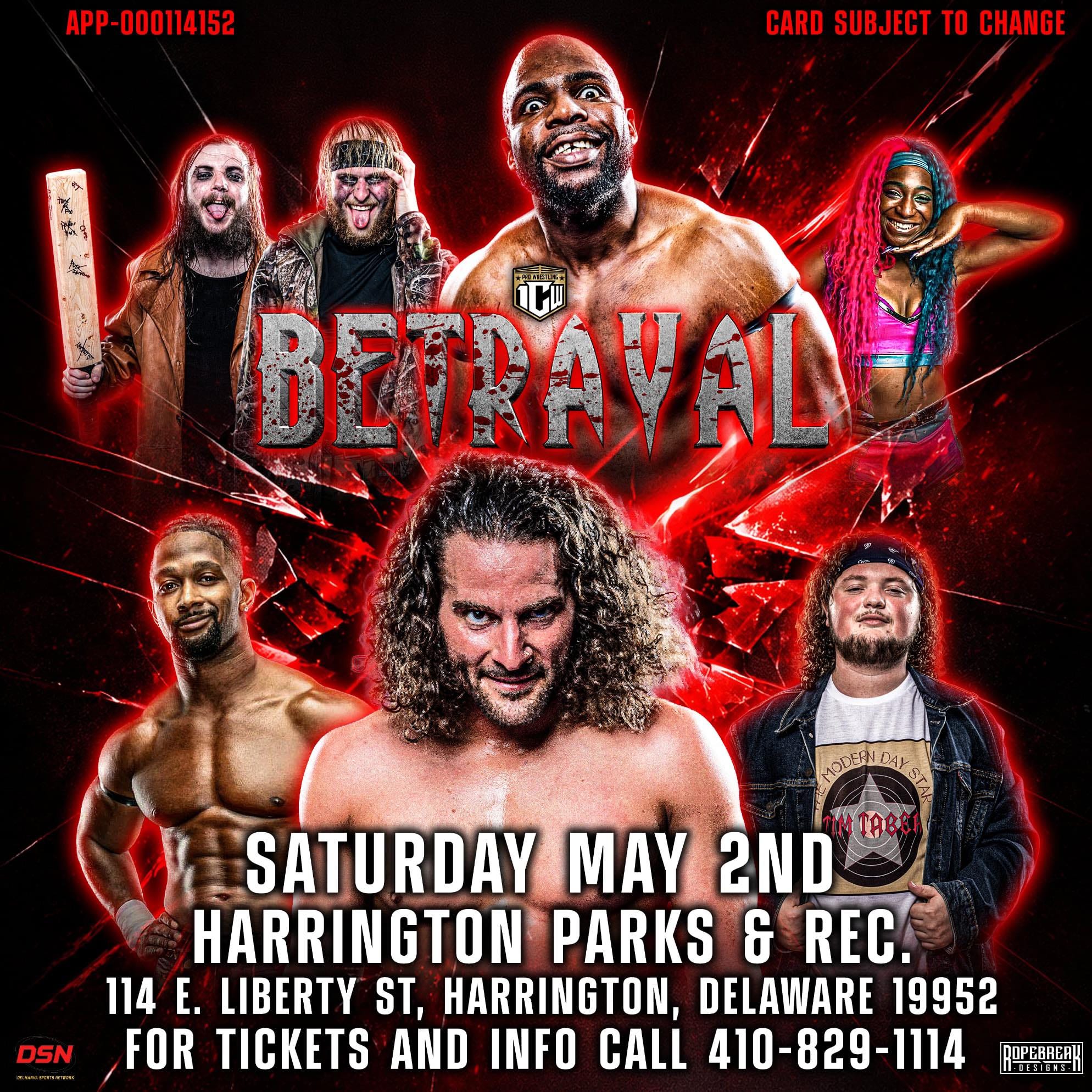 1CW Pro Wrestling presents Betrayal on Saturday, May 2, 2026, at Harrington Parks & Rec on East Liberty Street in Harrington, Delaware. The doors open at 5 p.m. and the bell time is 6 p.m. For tickets and more information, call (410) 829-1114.