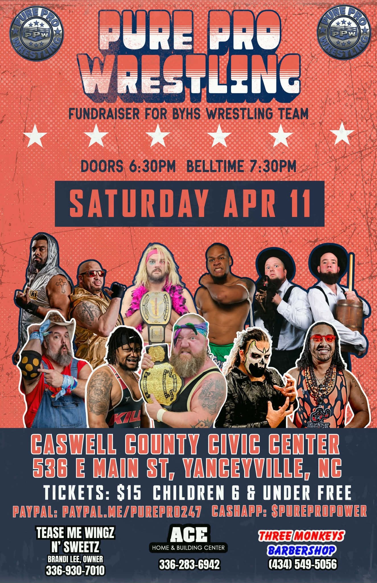 Pure Pro Wrestling presented a show on Saturday, April 11, 2026, at the Caswell County Civic Center in Yanceyville, North Carolina. Results are below.