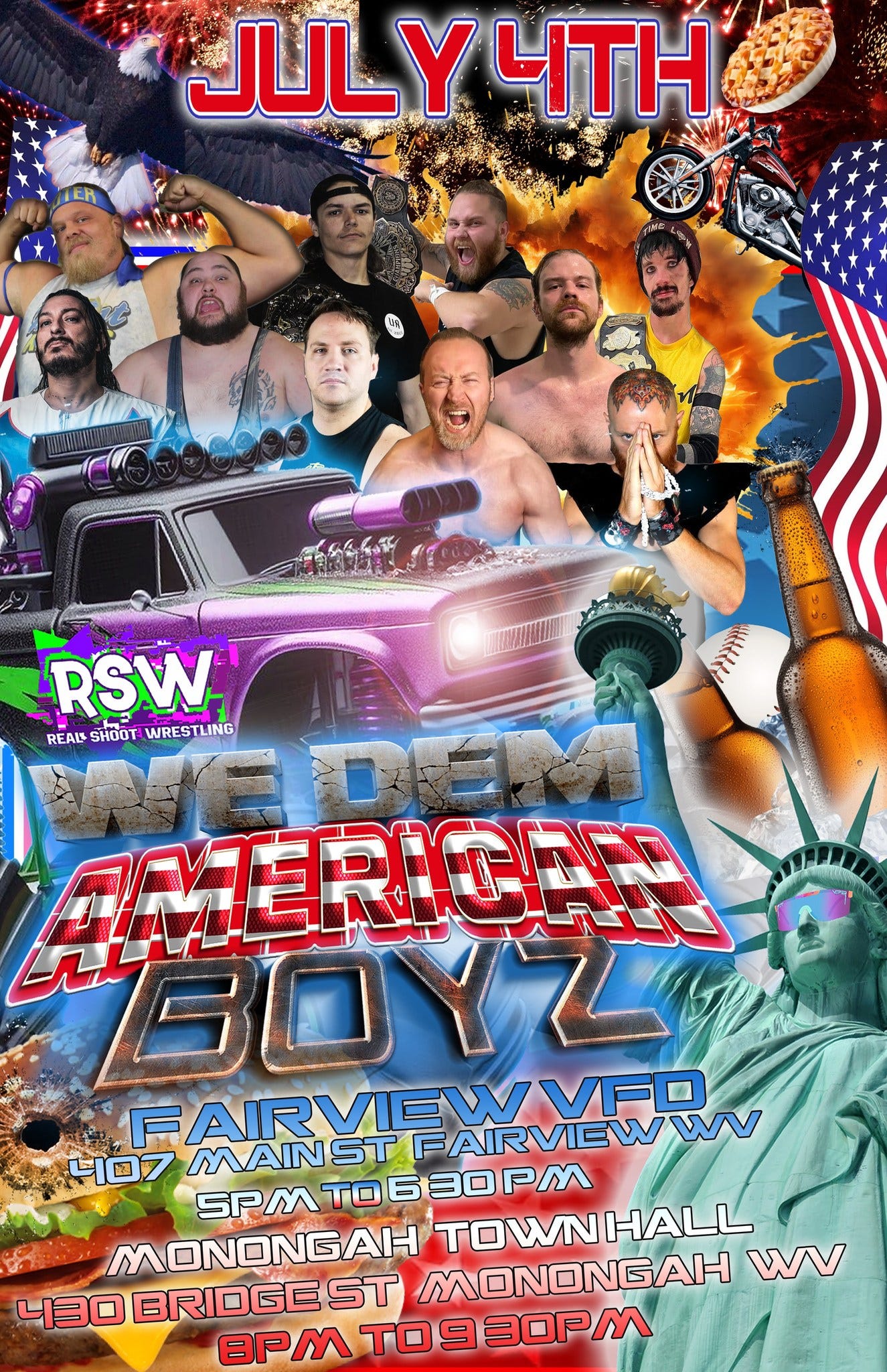 Thursday, July 4, Real Shoot Wrestling will be hosting two FREE shows at local 4th of July celebrations in Fairview, WV, and Monongah, WV.