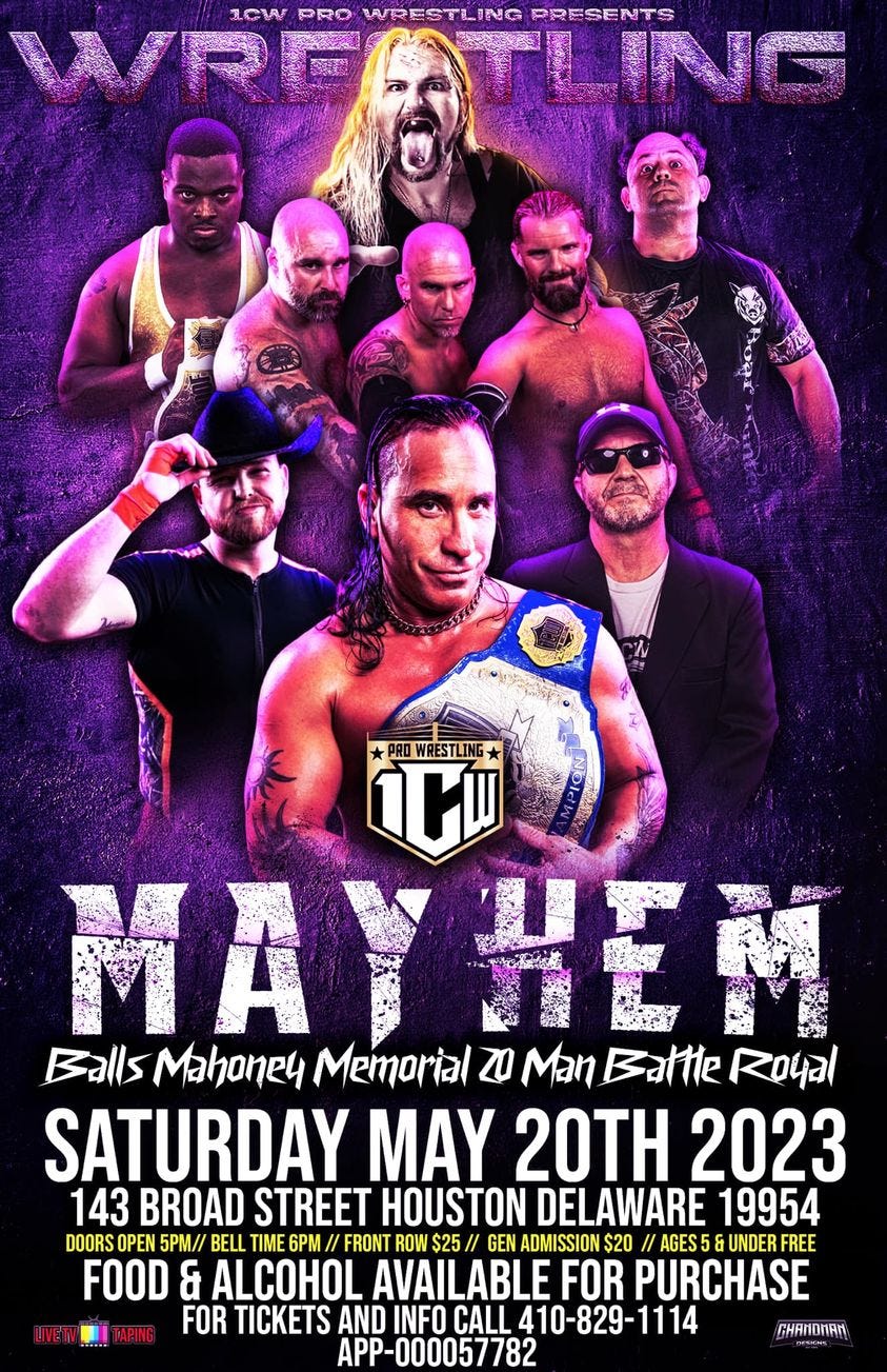 On Saturday, May 20, 1CW presents the Balls Mahoney Memorial 20-Man Battle Royal in Houston, DE.
