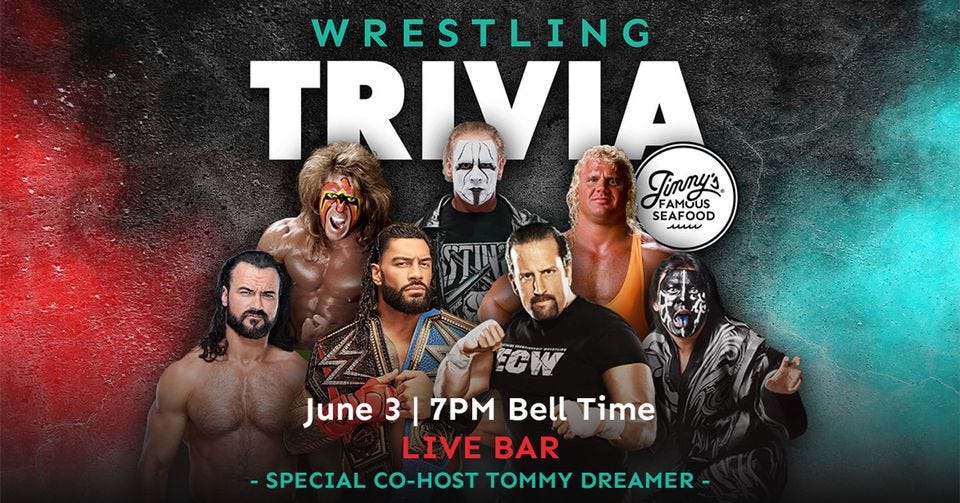 On Monday, June 3, Jimmy’s Famous Seafood will hold its latest edition of Wrestling Trivia. ECW Original Tommy Dreamer will co-host the trivia contest along with Jimmy’s in-house expert Big Mike, The event starts at 7 p.m. Tickets are available online.