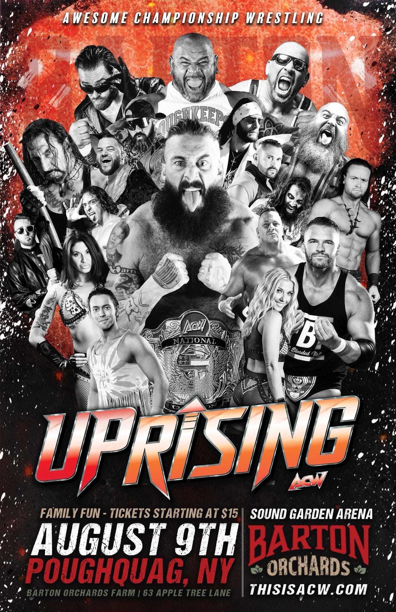 Awesome Championship Wrestling will be in Poughquag, New York, on Saturday, August 9, 2025, with Uprising at the Sound Garden Arena at Barton Orchards (63 Apple Tree Lane, Poughquag, NY 12570). Tickets are available online.