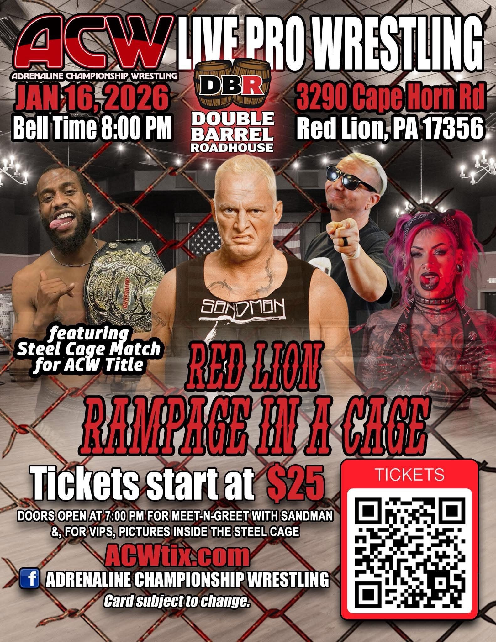 Adrenaline Championship Wrestling presents Rampage in a Cage on Friday, January 16, 2026, at Double Barrel Roadhouse in Red Lion, Pennsylvania. The bell time is 8 p.m. Tickets and information are available online.
