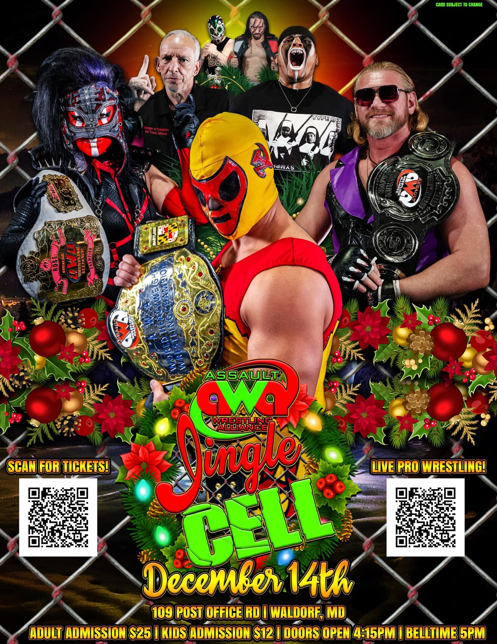 Assault Wrestling Alliance presented Jingle Cell live from The Assault Asylum at 109 Post Office Road, Waldorf, MD, on December 14, 2024. Every match was contested within an iron cell and under hardcore rules as declared by Commissioner Bill Alfonso.