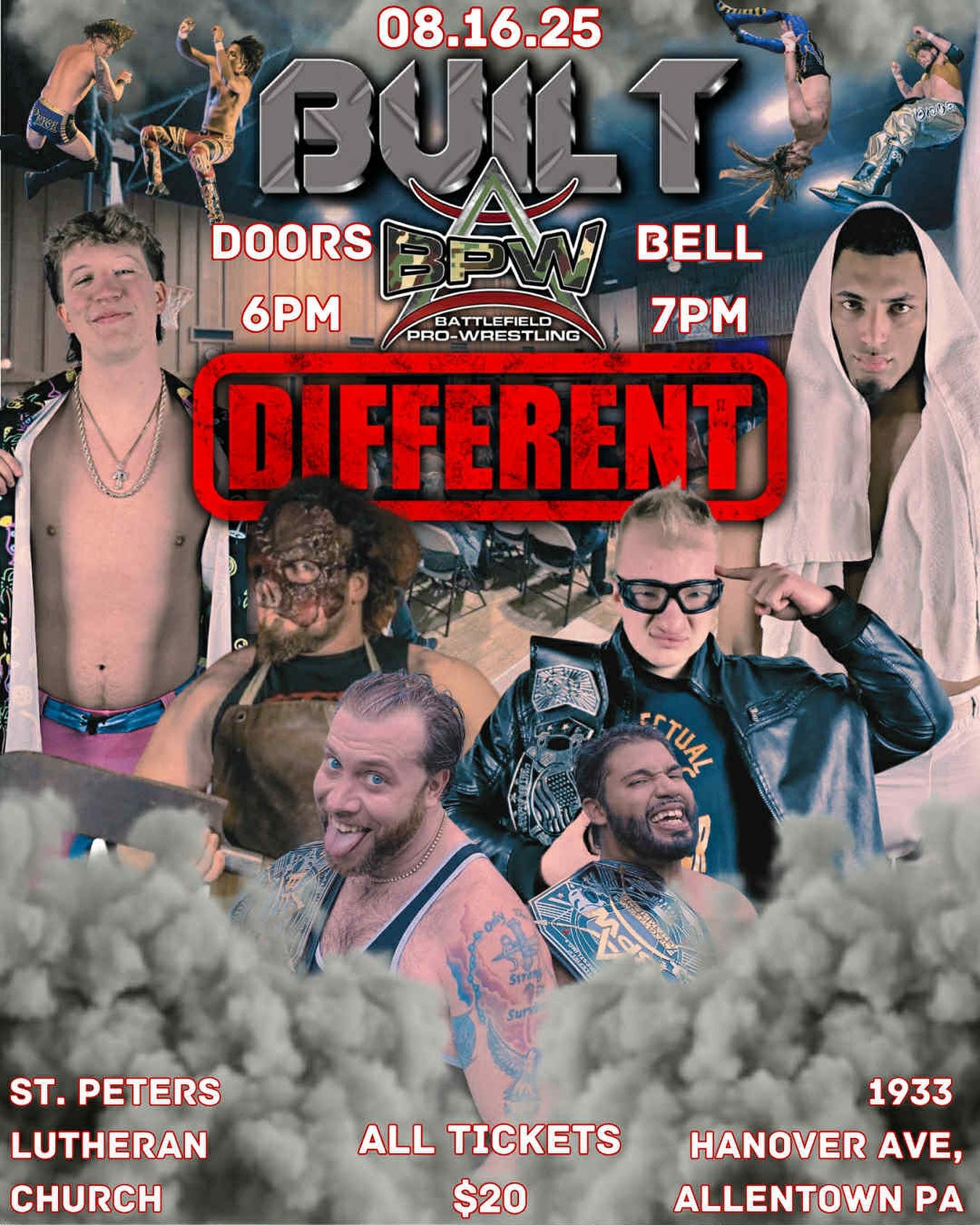 Battlefield Pro Wrestling will hold Built Different at St. Peters Lutheran Church, 1933 Hanover Ave, Allentown, PA, on Saturday, August 16, 2025. Doors open at 6 p.m. and bell time is 7 p.m. All tickets are $20 and will be available at the door.
