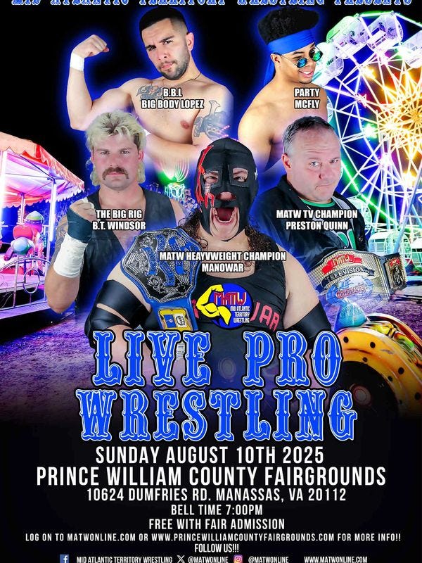 Mid-Atlantic Territory Wrestling returns to Manassas, Virginia, on Sunday, August 10, 2025, with live pro wrestling at the Prince William County Fairgrounds (10624 Dumfries Rd, Manassas, VA 20112). Bell time is scheduled for 7:00 p.m. Admission is free with paid fair entry.