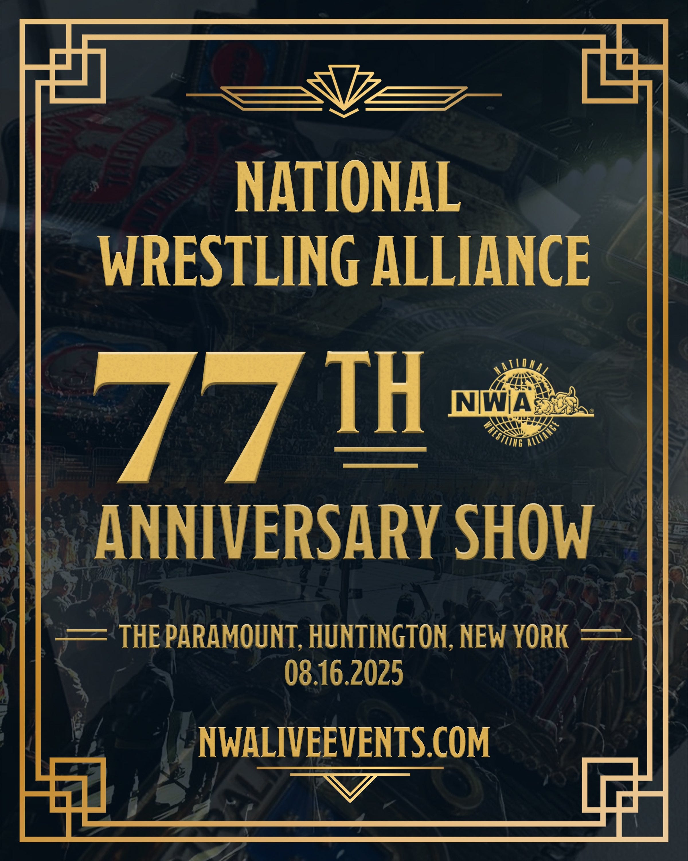 The National Wrestling Alliance will hold its 77th anniversary event, NWA 77, on Saturday, August 16, 2025, at The Paramount in Huntington, New York. The event marks 77 years since the founding of the NWA in 1948 and is being promoted as a major live show on the organization’s annual calendar.