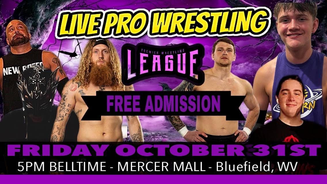 Premier Wrestling League presents live pro wrestling at Mercer Mall for Mall-O-Ween on Friday, October 31, 2025, at Mercer Mall in Bluefield, West Virginia. The bell time is 5 p.m., and admission is free.