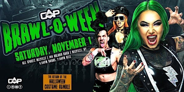 Create A Pro Wrestling will present Brawl-O-Ween on Saturday, November 1, 2025, at All Sportz Melville, 100 Ruland Road in Melville, New York. The bell time is 7:30 p.m., with doors opening at 6:30 p.m. Tickets are available online.