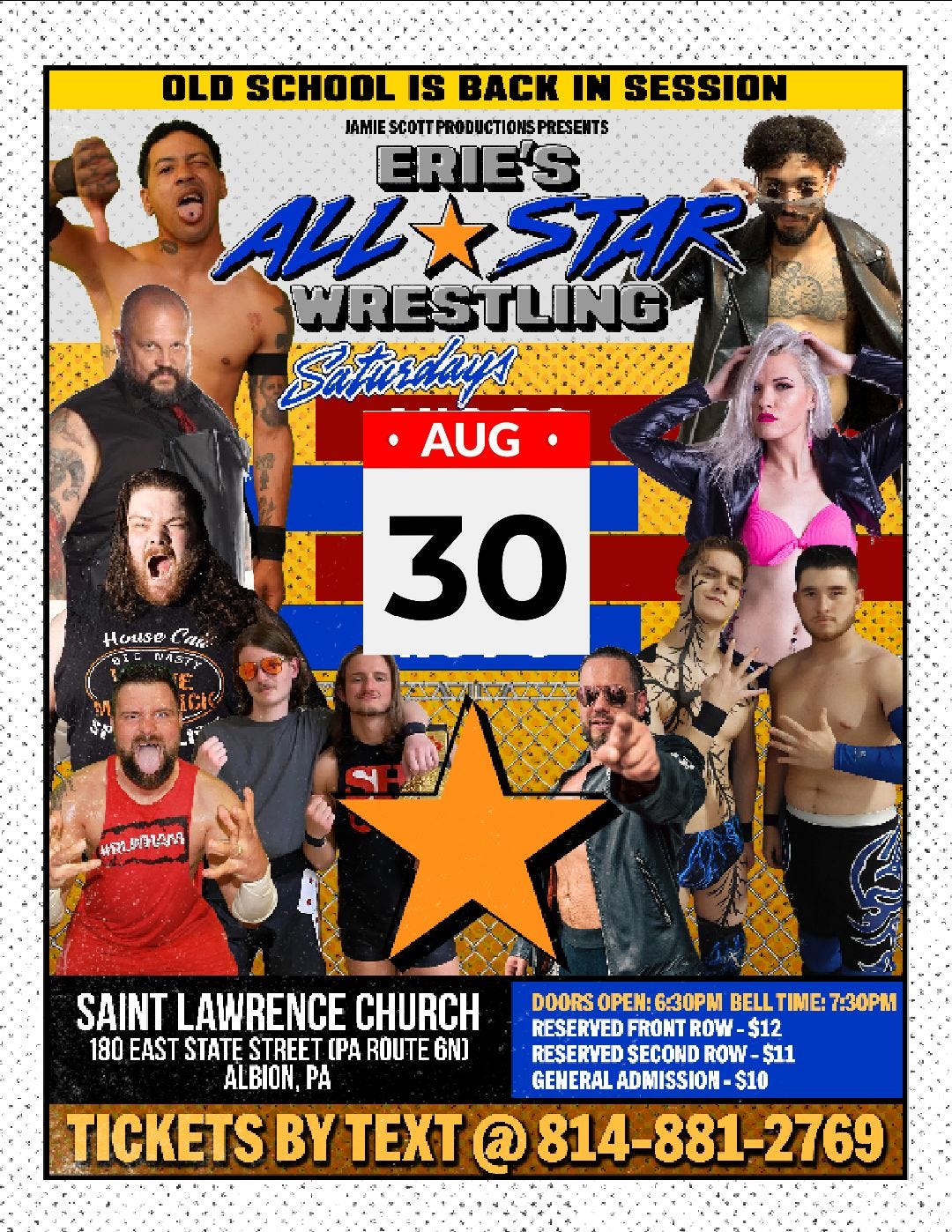 Erie’s All Star Wrestling will return on Saturday, August 30, 2025, at Saint Lawrence Church, 180 East State Street (PA Route 6N) in Albion, PA. Doors open at 6:30 p.m. and bell time is 7:30 p.m. Tickets are available by texting 814-881-2769.
