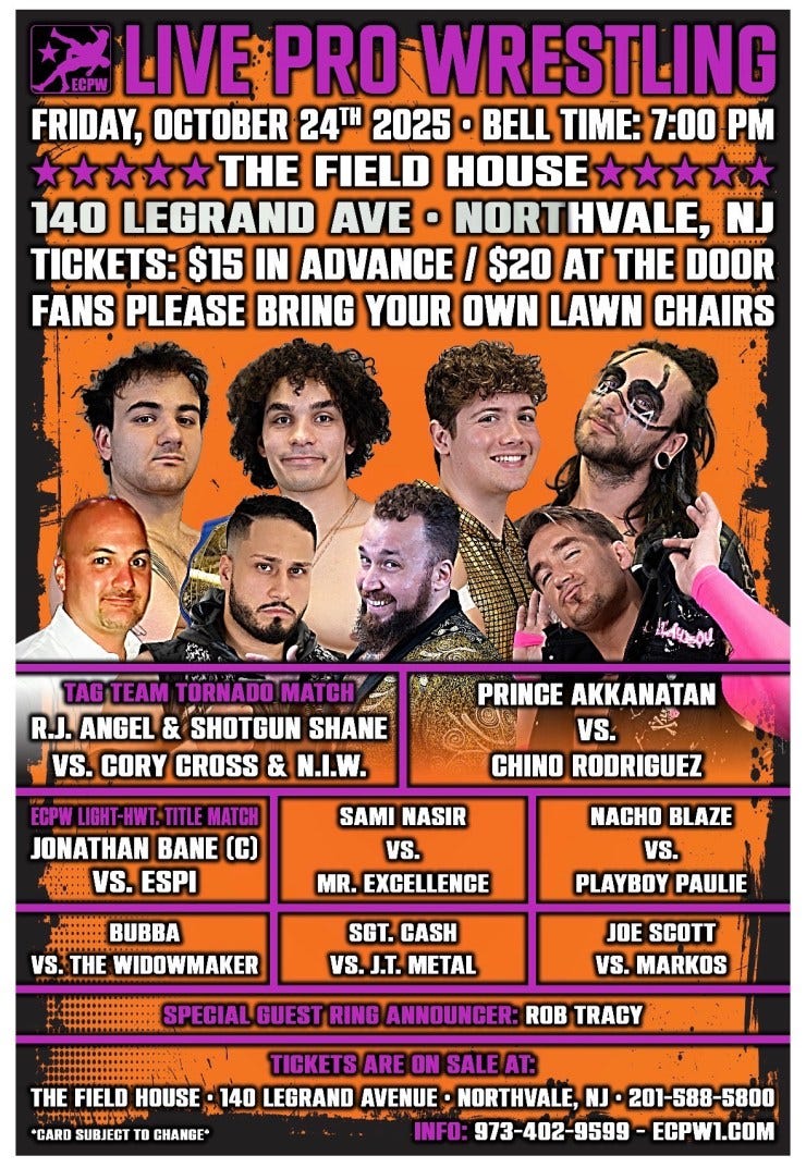 East Coast Professional Wrestling (ECPW) presents a live event on Friday, October 24, 2025, at The Field House, 140 Legrand Avenue in Northvale, New Jersey. The bell time is 7 p.m. Tickets are available online.