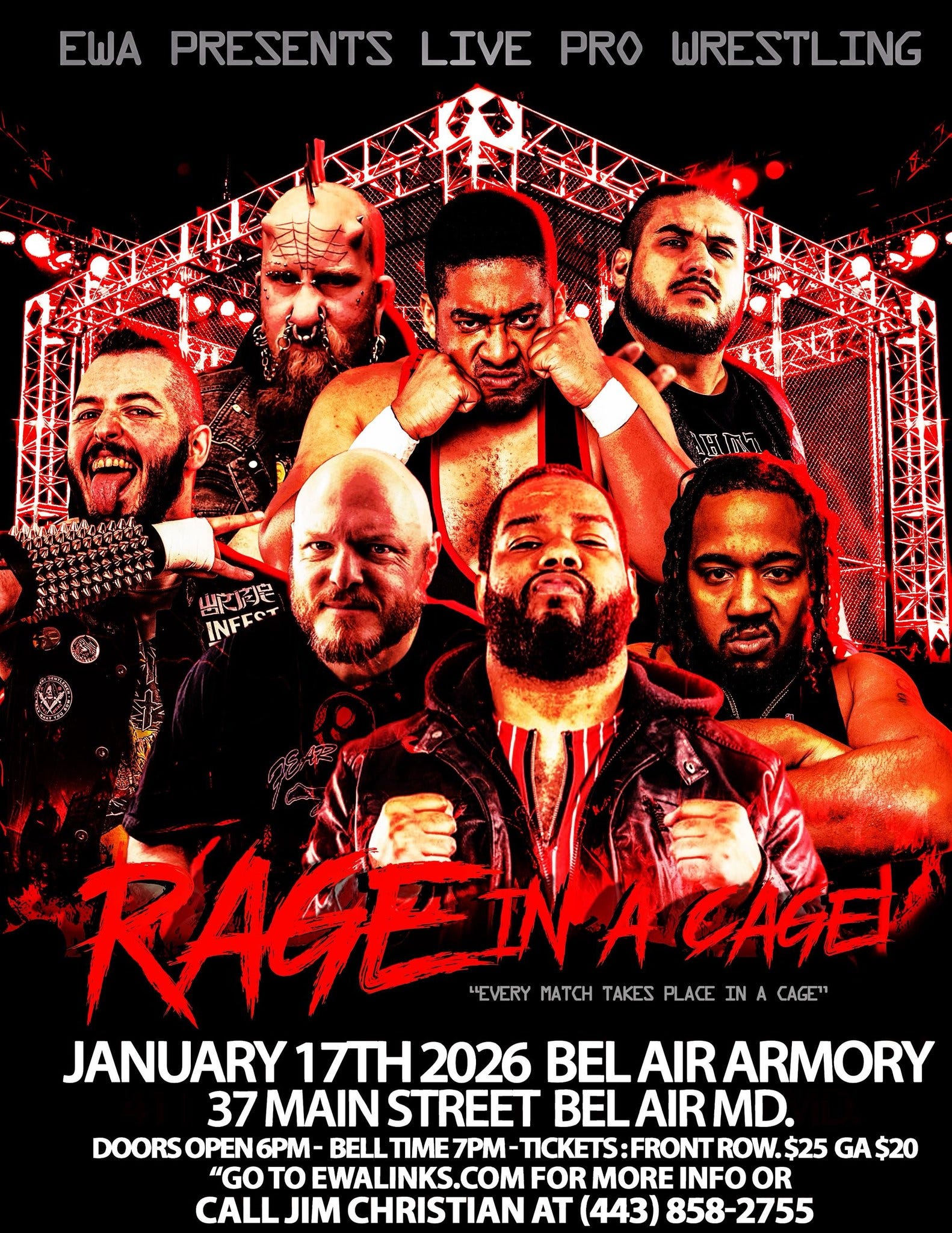 EWA presents Rage in a Cage on Saturday, January 17, 2026, at the Bel Air Armory in Bel Air, Maryland. Doors open at 6 p.m. The appetizer match begins at 7 p.m., with bell time set for 7:30 p.m. Tickets and information are available online.