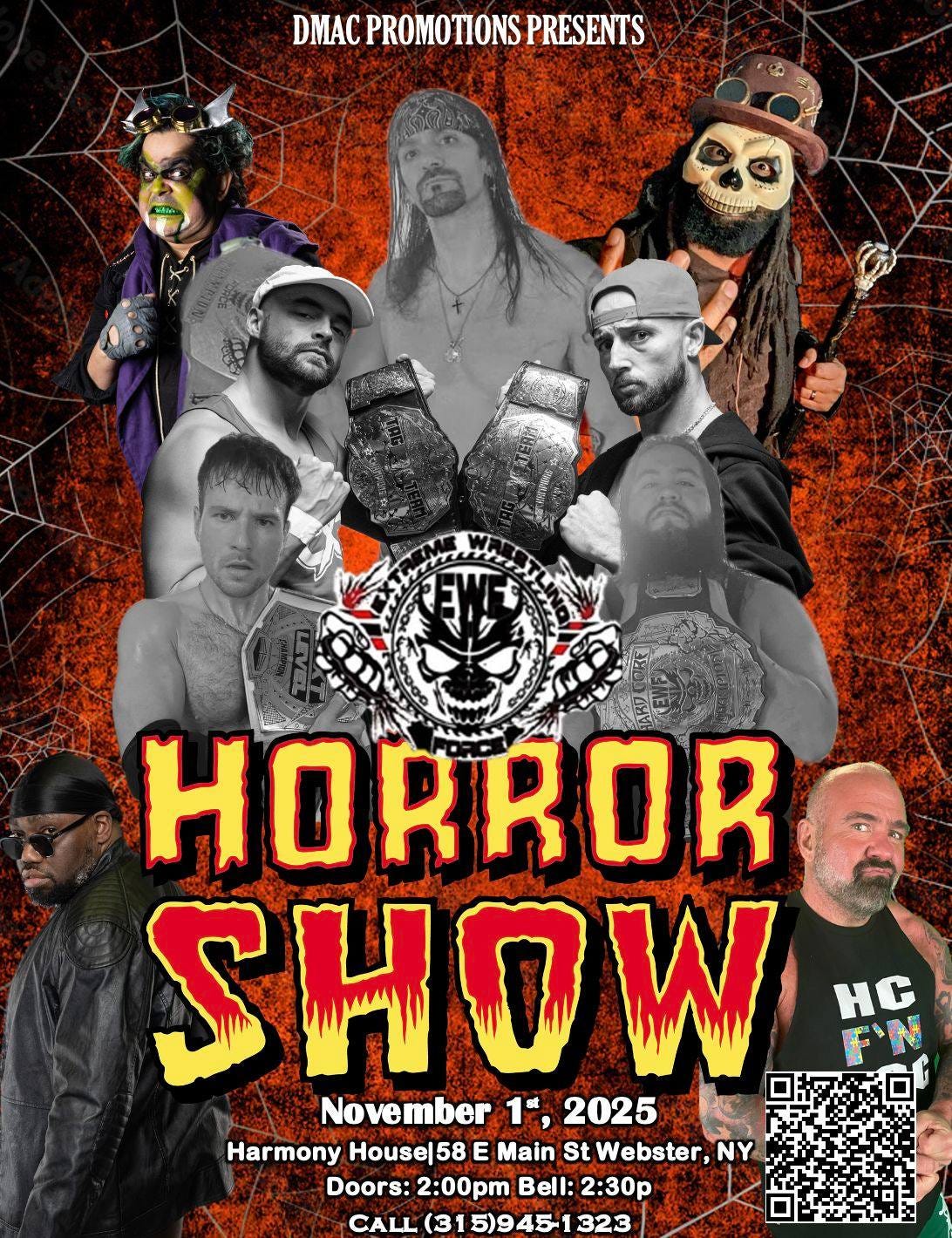 Extreme Wrestling Force (EWF) will present Horror Show on Saturday, November 1, 2025, at Harmony House, 58 E Main Street in Webster, New York. The bell time is 2:30 p.m., with doors opening at 2:00 p.m. Tickets are available online.