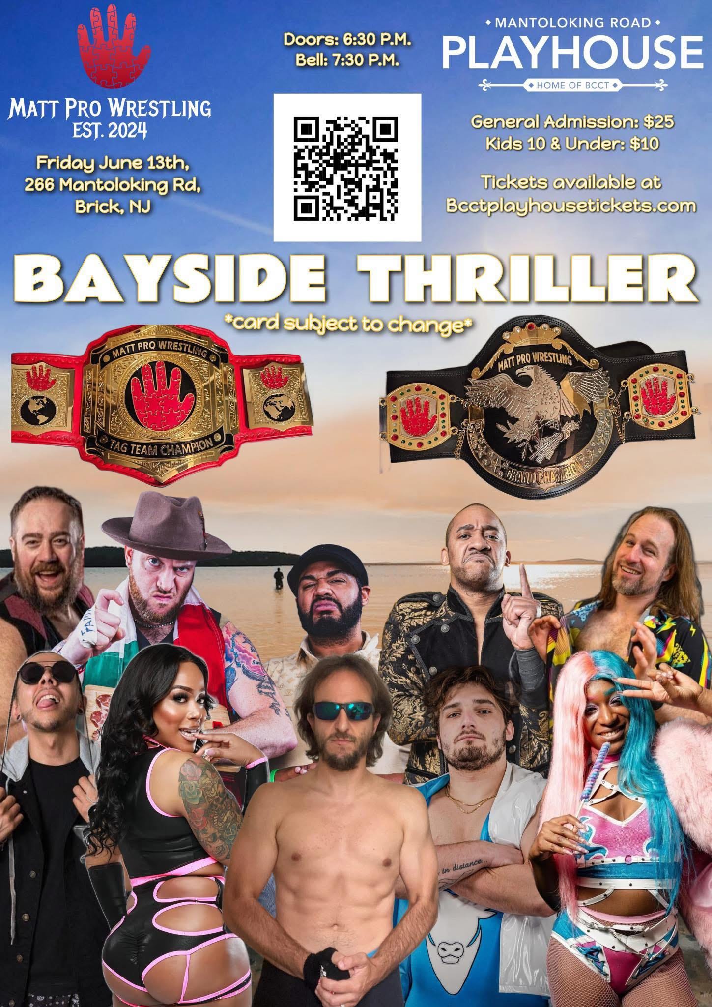 Matt Pro Wrestling will present Bayside Thriller on Friday, June 13, 2025, at the Mantoloking Road Playhouse, located at 266 Mantoloking Rd, Brick, New Jersey. Doors open at 6:30 p.m. and bell time is scheduled for 7:30 p.m. Tickets are available online.