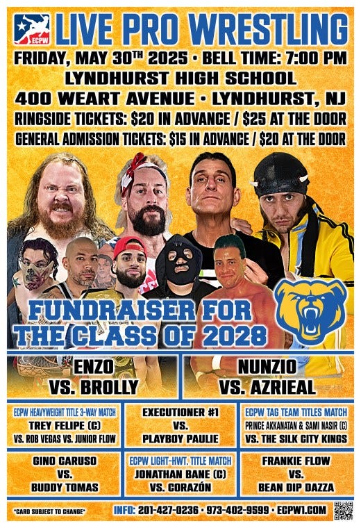 ECPW presents a live pro wrestling event on Friday, May 30, 2025, at Lyndhurst High School, located at 400 Weart Avenue, Lyndhurst, NJ. Bell time is scheduled for 7:00 PM. Tickets are available online.