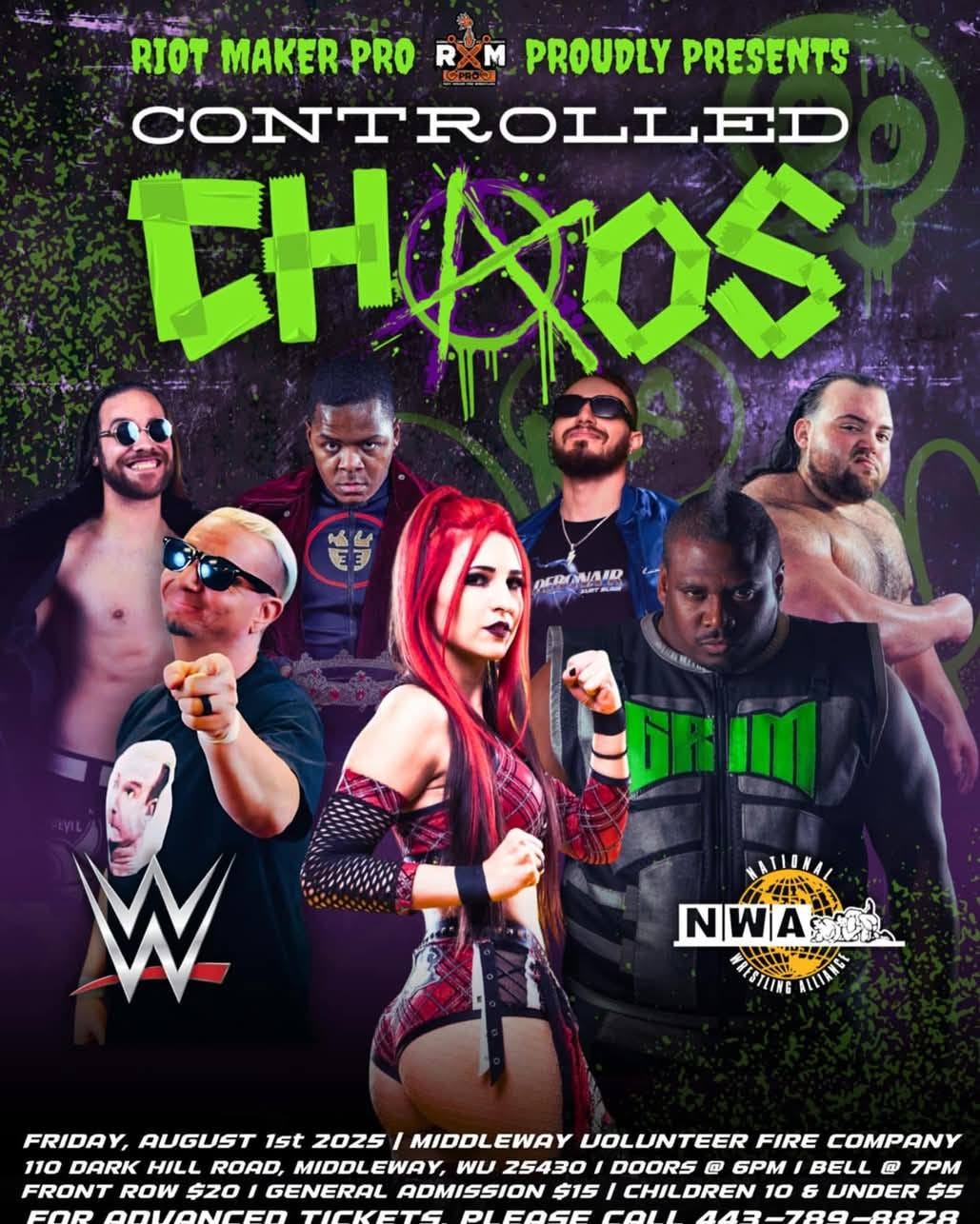 Riot Maker Pro returns to action in Middleway, West Virginia, on Friday, August 1, 2025, with Controlled Chaos at the Middleway Volunteer Fire Company (110 Dark Hill Road, Middleway, WV 25430). Doors open at 6:00 p.m. and bell time is scheduled for 7:00 p.m. For advanced tickets, please call (443) 789-8828.