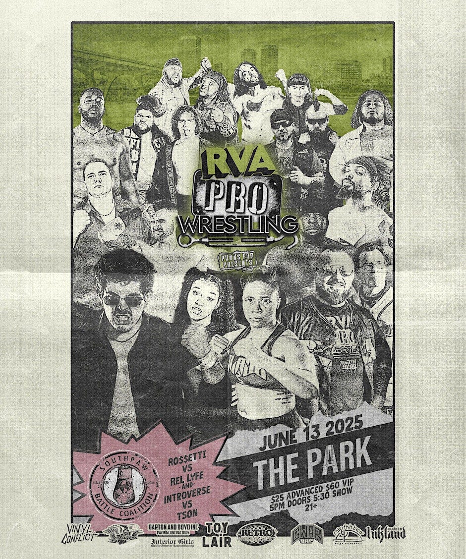 RVA Pro Wrestling will present an event on Friday, June 13, 2025, at The Park, located at 2601 Durham Street, Richmond, VA 23220. Doors open at 5:00 p.m. and the show is scheduled to begin at 5:30 p.m. Tickets are available online.