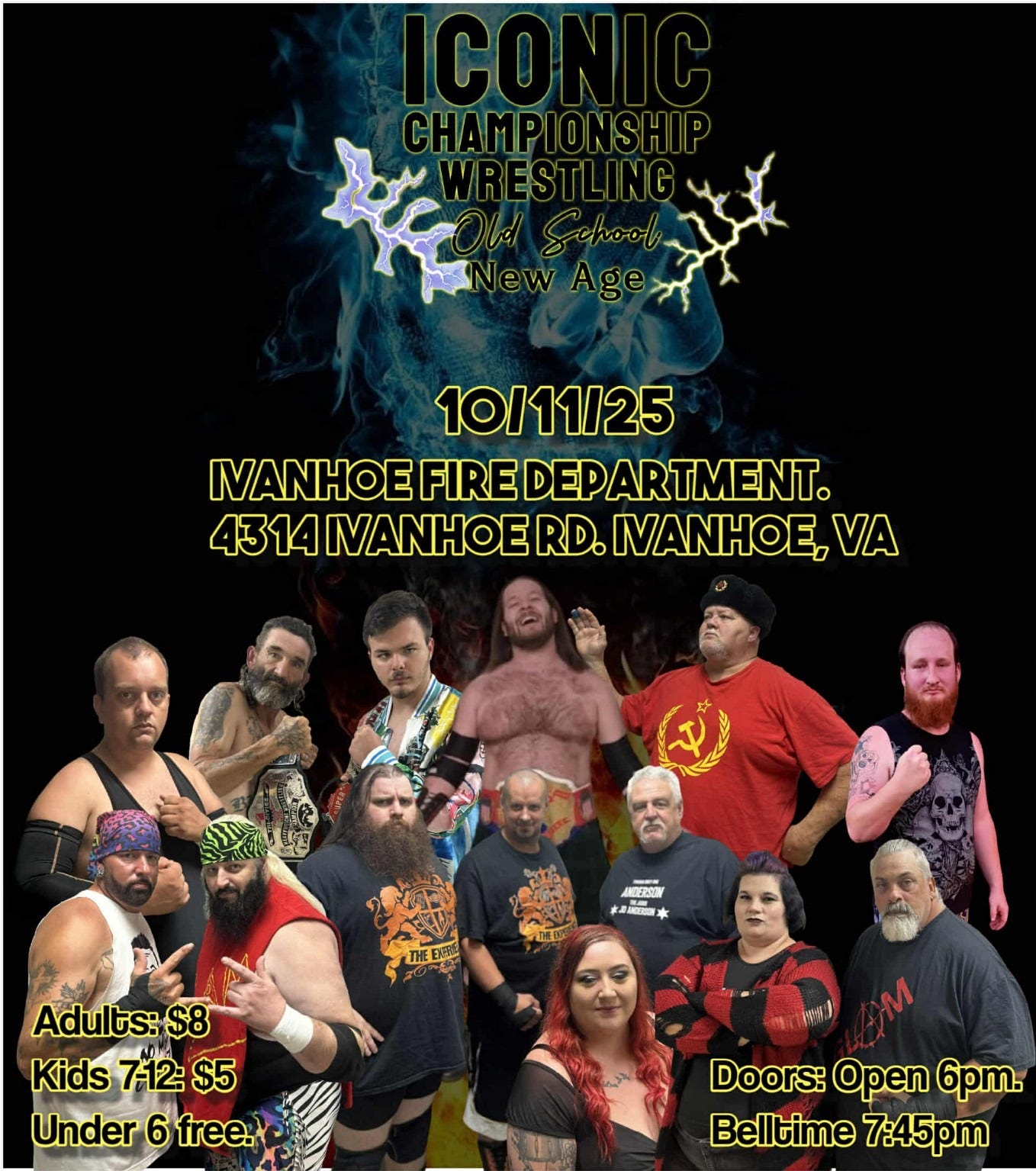 AIWF Mid Atlantic Wrestling and Iconic Championship Wrestling will present a joint event on Saturday, October 11, 2025, at the Ivanhoe Fire Department, 4314 Ivanhoe Road, Ivanhoe, VA. Doors open at 6:30 PM, and bell time is 7:30 PM.