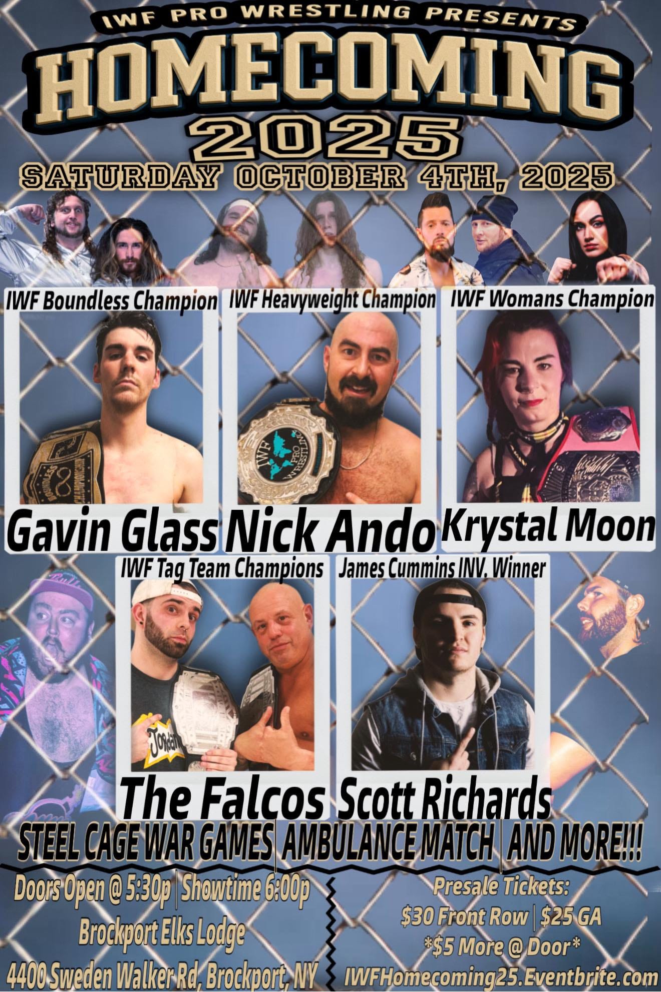 WF Pro Wrestling will hold Homecoming 2025 at the Brockport Elks Lodge, 4400 Sweden Walker Road, Brockport, NY, on Saturday, October 4, 2025. Doors open at 5:30 PM and the bell time is 6:00 PM. Tickets are available online.