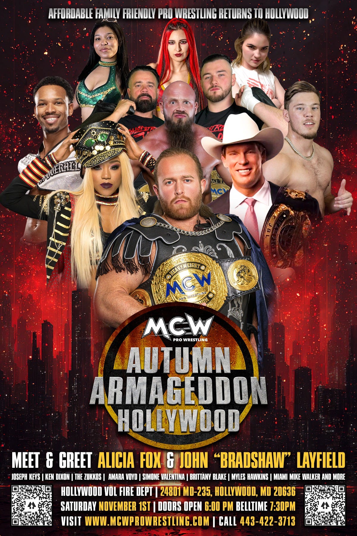 MCW Pro Wrestling will present Autumn Armageddon on Saturday, November 1, 2025, at the Hollywood Volunteer Fire Department, 24801 MD-235 in Hollywood, Maryland. The bell time is 7:30 p.m., with doors opening at 6 p.m. Tickets are available online.