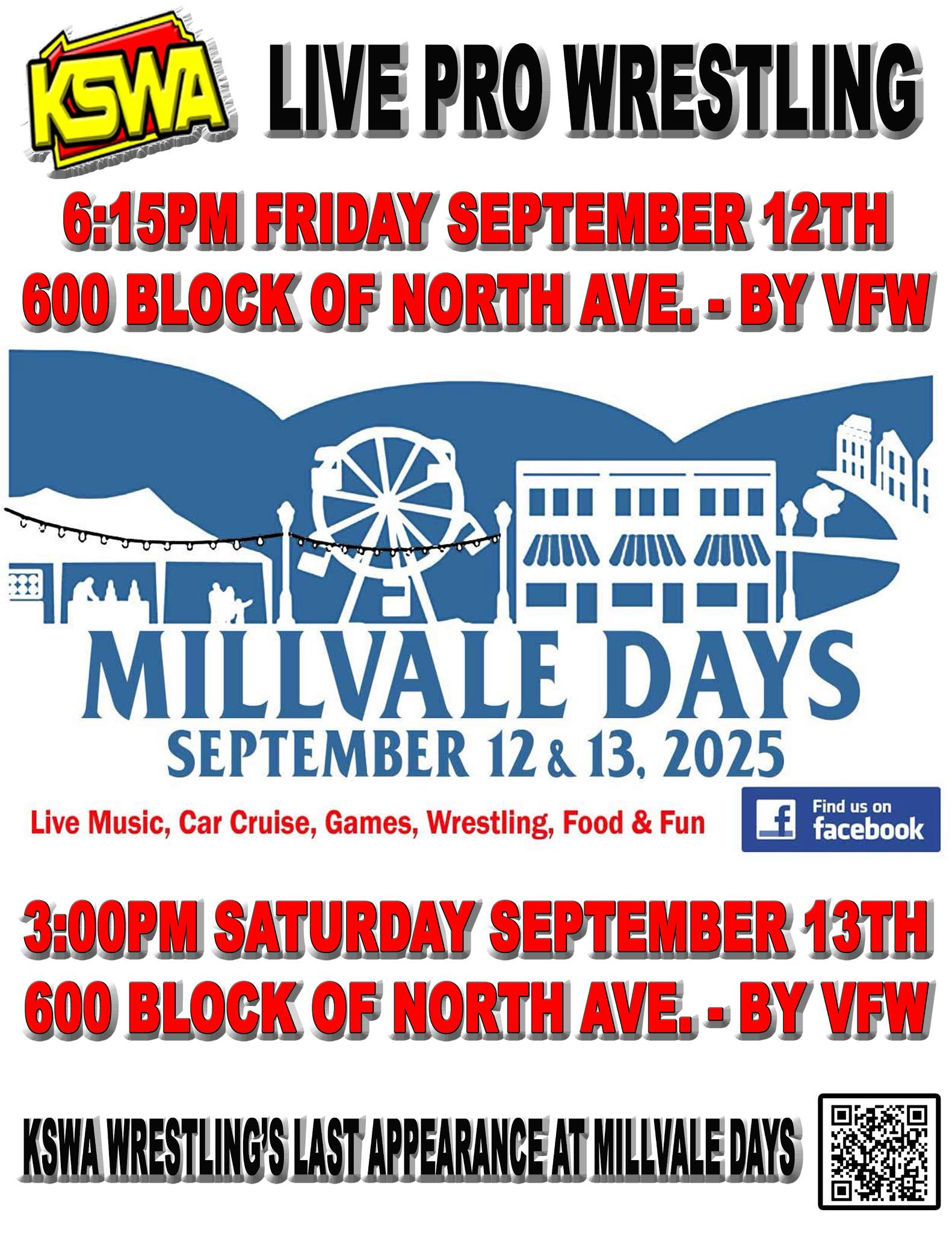 Keystone State Wrestling Alliance (KSWA) will hold free live pro wrestling as part of Millvale Days at the 600 block of North Ave., by the VFW, in Millvale, Pennsylvania, on Friday, September 12, 2025, at 6:15 p.m. and Saturday, September 13, 2025, at 3:00 p.m.