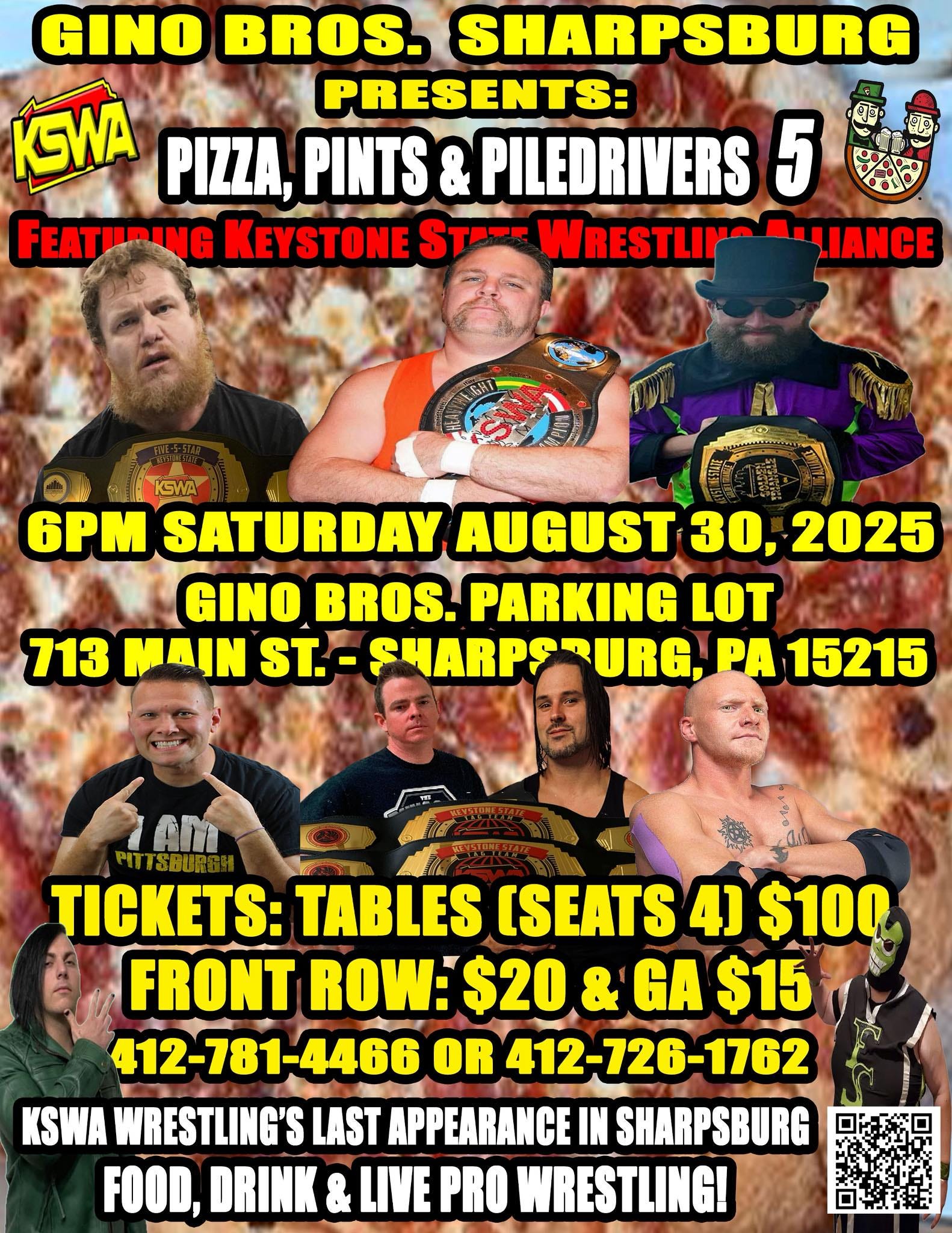 Gino Bros. will host Pizza, Pints & Piledrivers 5 featuring Keystone State Wrestling Alliance (KSWA) on Saturday, August 30, 2025, in Sharpsburg, PA. The event will take place in the Gino Bros. parking lot at 713 Main St. Bell time is 6 p.m. Tickets are available at the door or by calling 412-781-4466 or 412-726-1762.