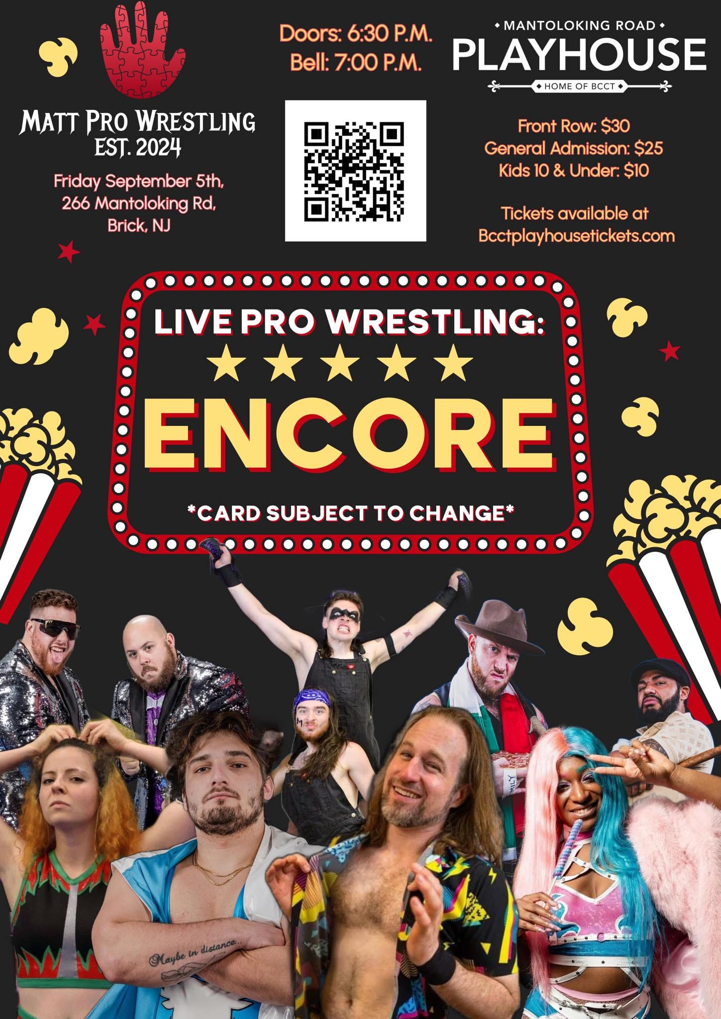 Matt Pro Wrestling will hold Encore at the Mantoloking Road Playhouse, 266 Mantoloking Rd, Brick, NJ, on Friday, September 5, 2025. Doors open at 6:30 PM and the bell time is 7:00 PM. Tickets are available online.