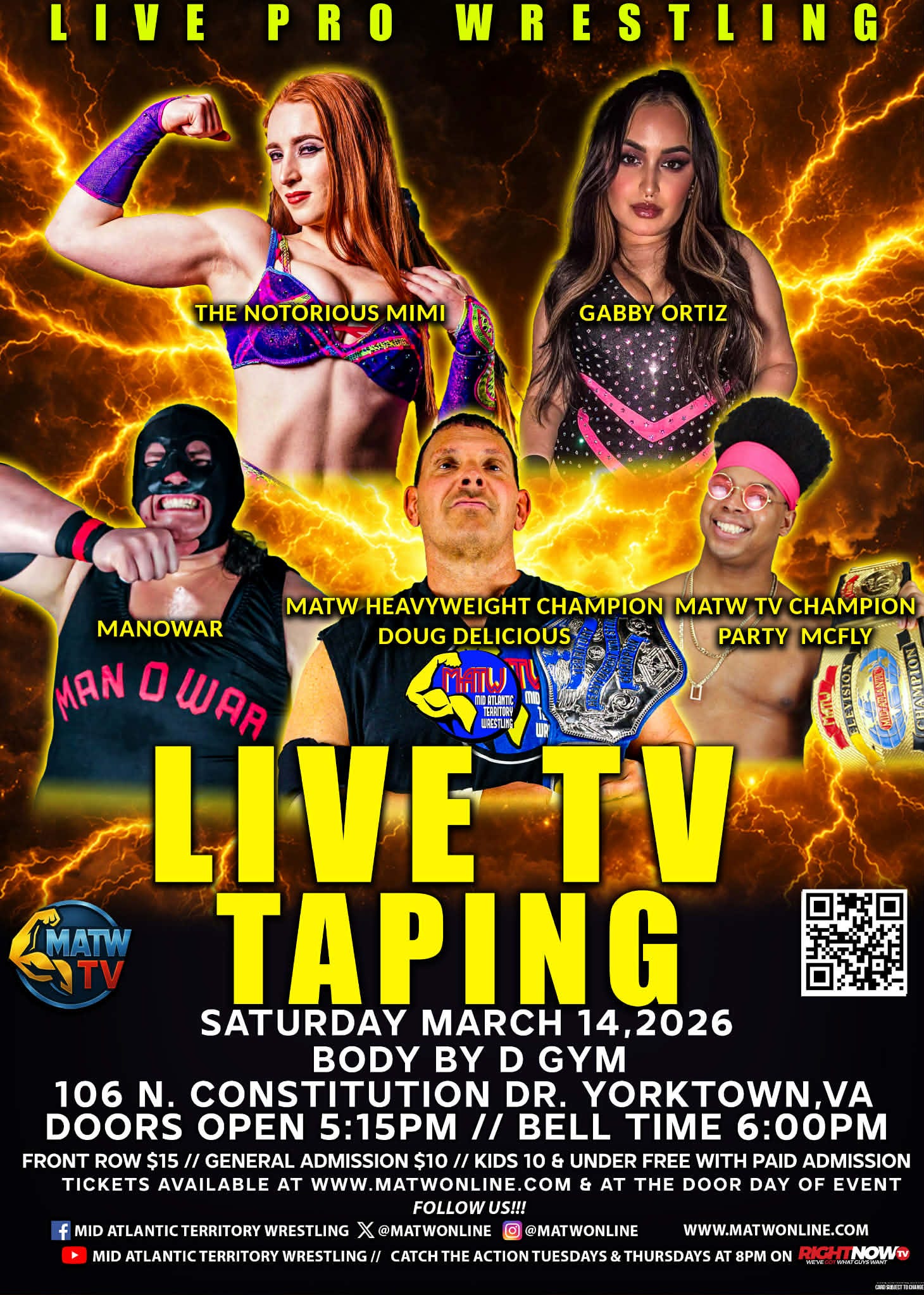 Mid Atlantic Territory Wrestling will hold a live TV taping at Body By D Gym, 106 N. Constitution Dr., in Yorktown, Virginia on Saturday, March 14, 2026. The doors open at 5:15 p.m. and the bell time is 6 p.m. Tickets are available online.