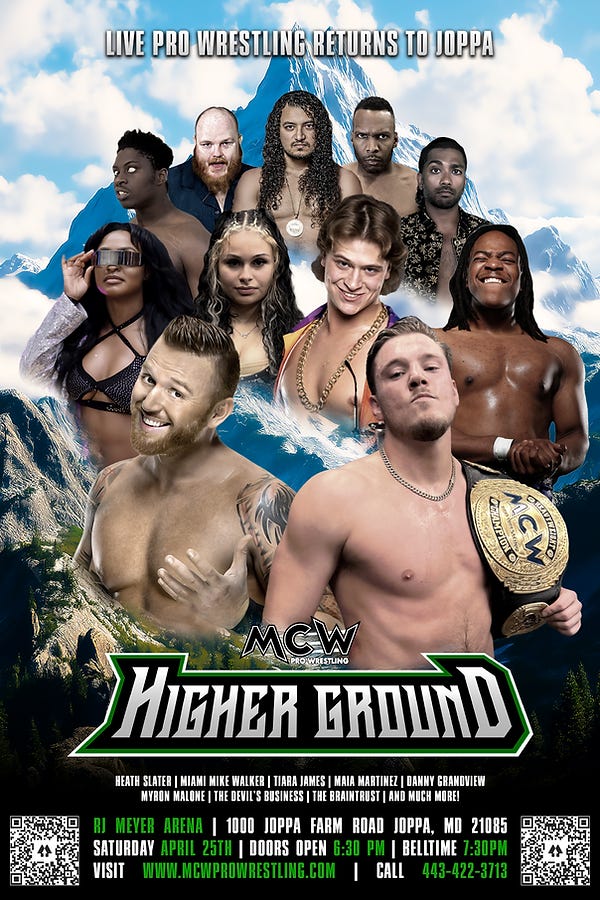 MCW Pro Wrestling presents Higher Ground on Saturday, April 25, 2026, at RJ Meyer Arena, 1000 Joppa Farm Road in Joppa, Maryland. The bell time is 7:30 p.m., with doors opening at 6:30 p.m. Tickets are available online.
