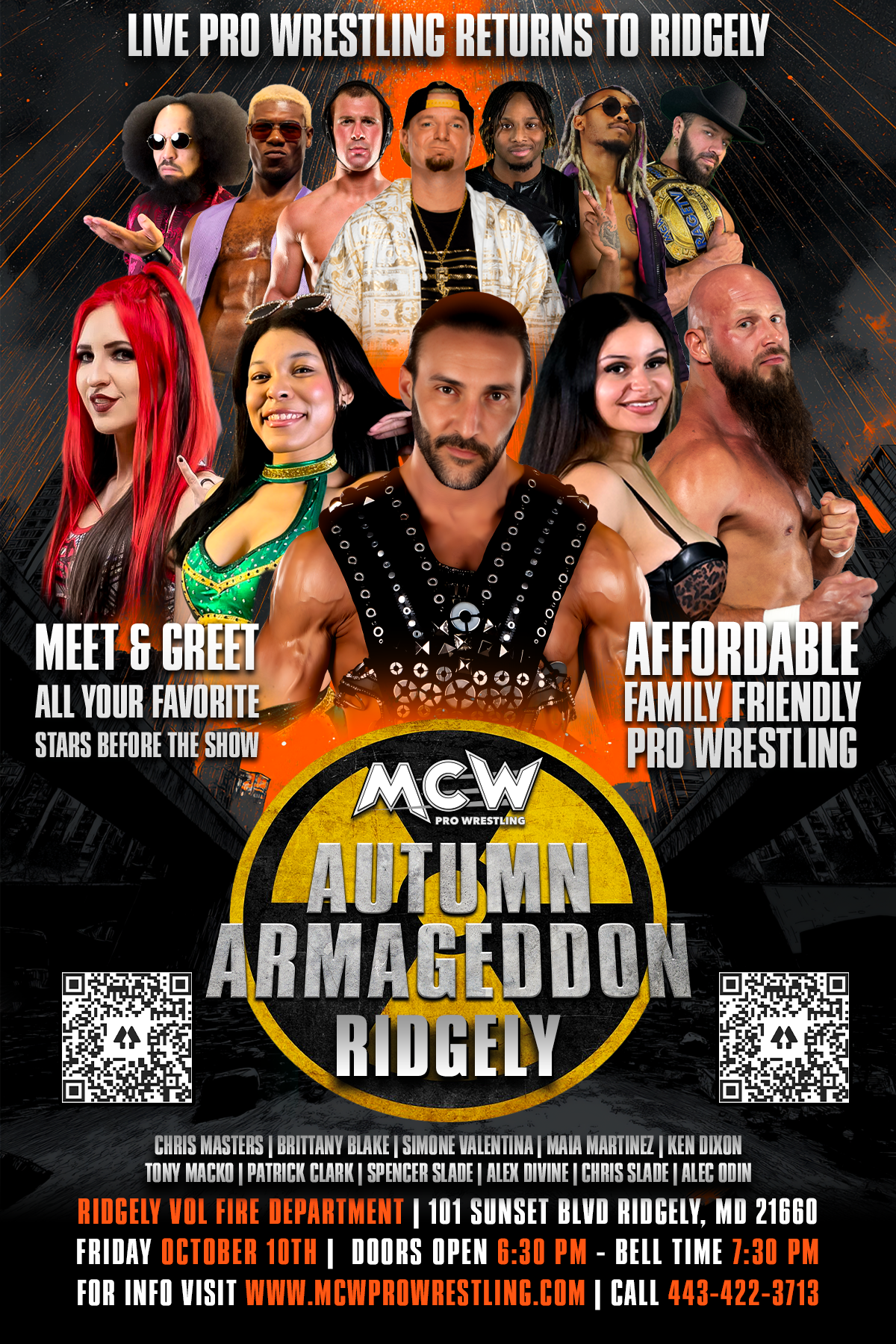 MCW Pro Wrestling will hold Autumn Armageddon at Ridgely Volunteer Fire Hall, 101 Sunset Blvd, Ridgely, MD on Friday, October 10, 2025. The bell time is 7:30 PM. Tickets are available online.