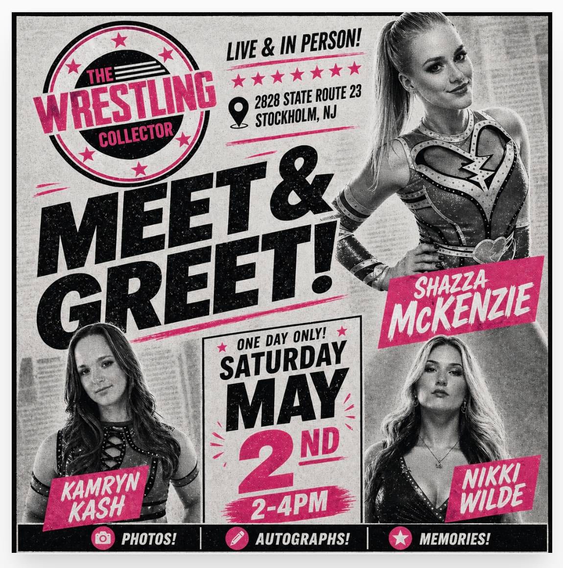 The Wrestling Collector will host a meet and greet event on Saturday, May 2, 2026, at 2828 State Route 23 in Stockholm, New Jersey. The event will run from 2 p.m. to 4 p.m. Shazza McKenzie, Kamryn Kash, and Nikki Wilde are scheduled to appear for photos and autographs.