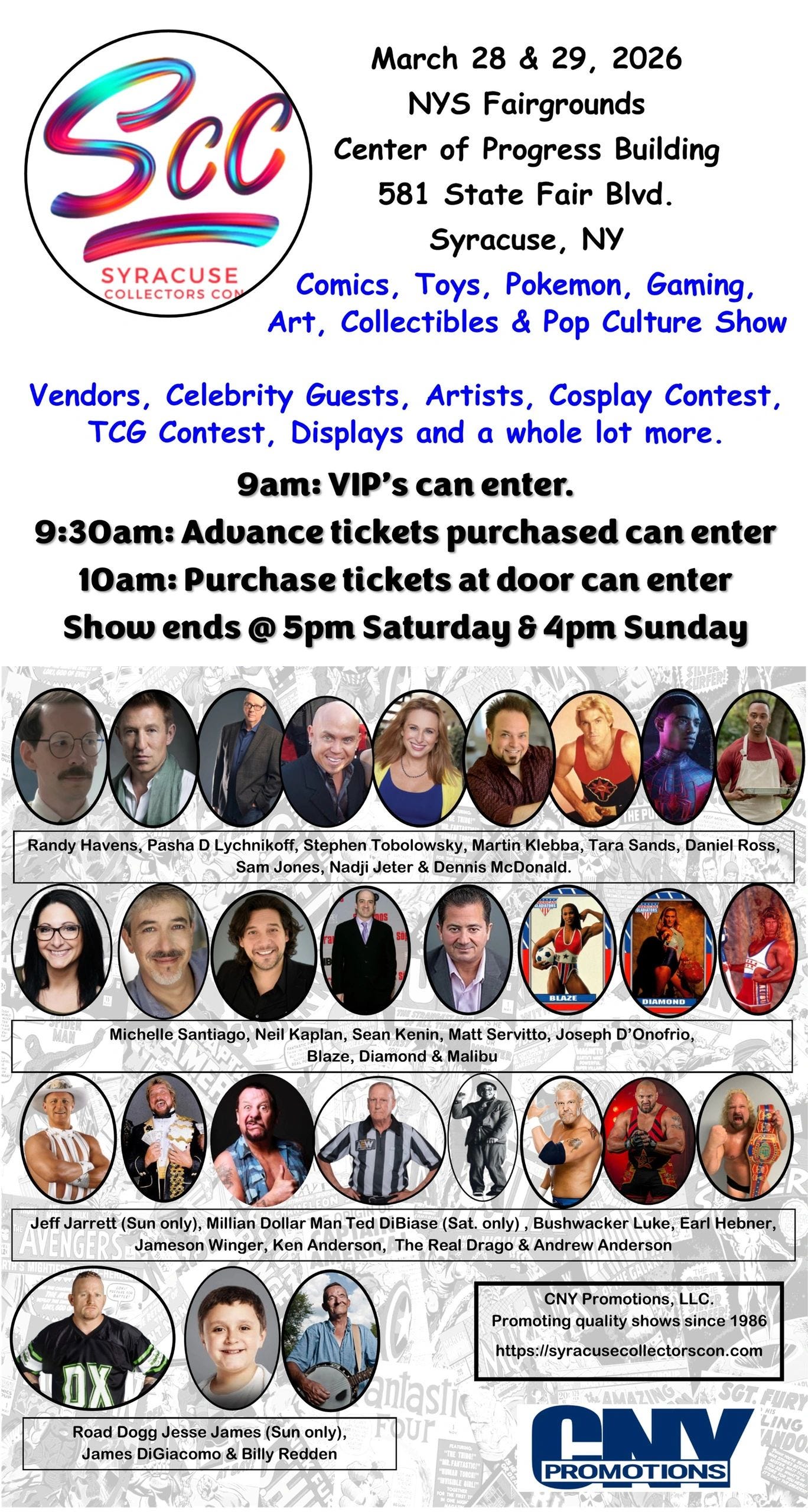 Syracuse Collectors Con will hold an event at the Center of Progress Building, 581 State Fair Blvd., in Syracuse, New York on Saturday, March 28, 2026, and Sunday, March 29, 2026. The doors open at 9 a.m. for VIP admission, 9:30 a.m. for advance ticket holders, and 10 a.m. for general admission. The show ends at 5 p.m. on Saturday and 4 p.m. on Sunday. Tickets and more information are available online.