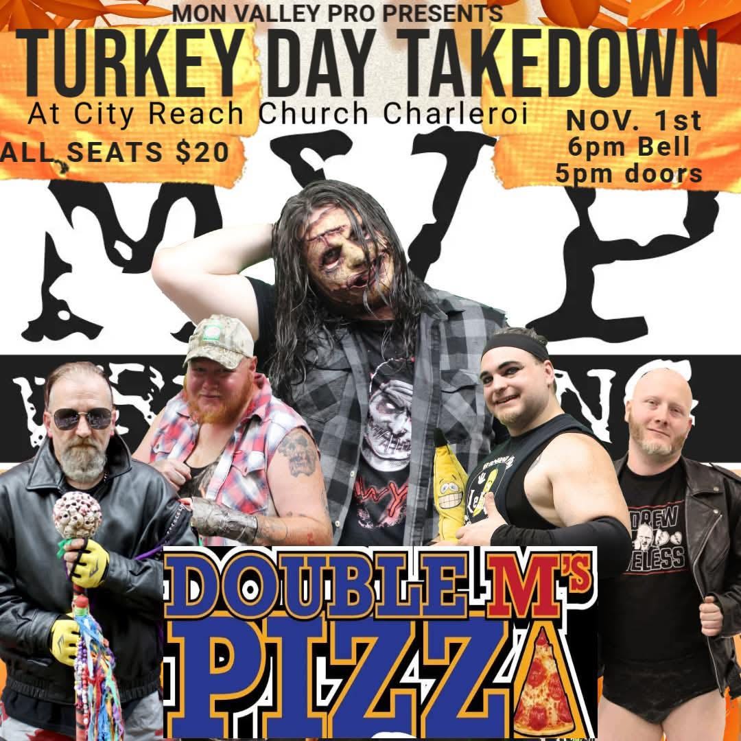 Mon Valley Pro Wrestling presents Turkey Day Takedown on Saturday, November 1, 2025, at City Reach Church in Charleroi, Pennsylvania. The bell time is 6 p.m., and doors open at 5 p.m. Tickets will be available at the door.