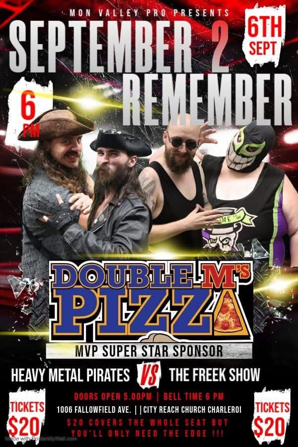 Mon Valley Pro Wrestling will hold September 2 Remember at City Reach Church, 1006 Fallowfield Ave., in Charleroi, PA, on Saturday, September 6, 2025. Doors open at 5 p.m. and the bell time is 6 p.m. Tickets are $20 and available at the door.