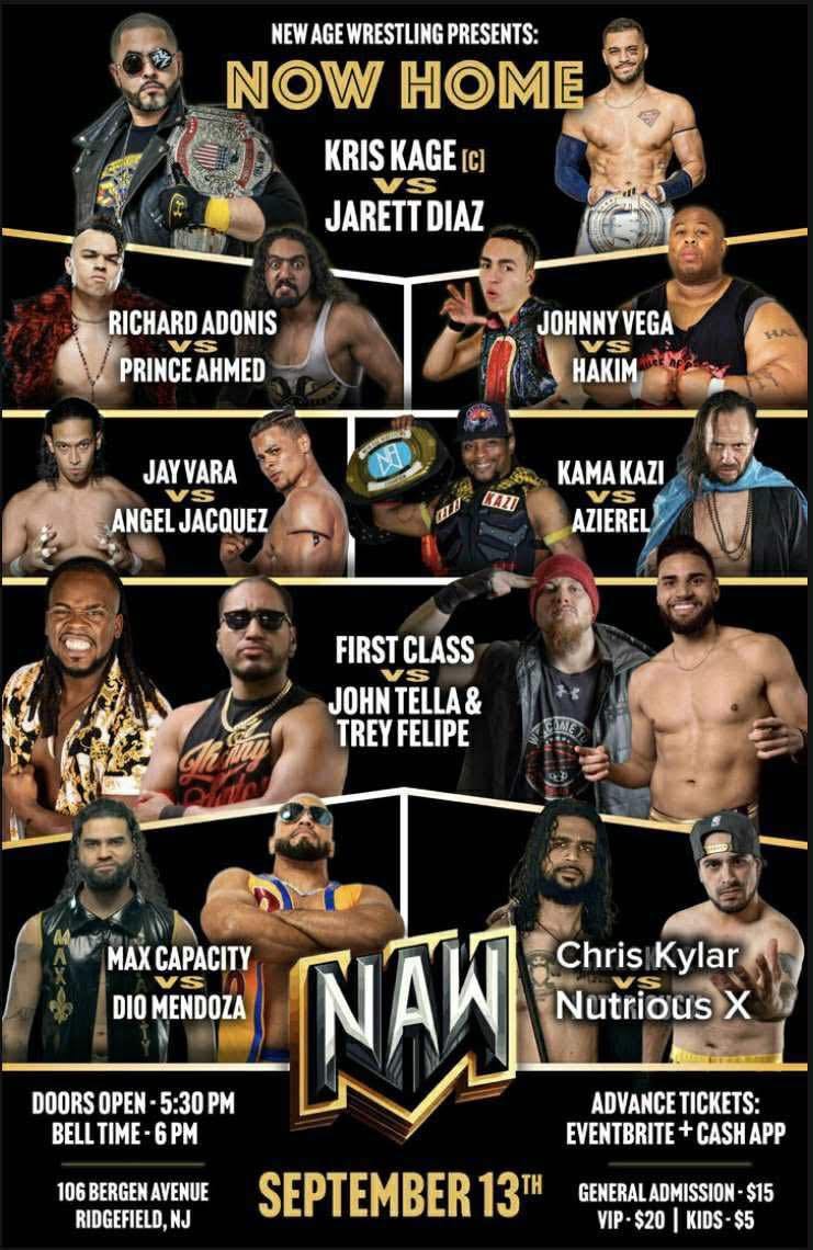 New Age Wrestling will hold Now Home at 106 Bergen Avenue, Ridgefield, NJ, on Saturday, September 13, 2025. Doors open at 5:30 p.m. and bell time is 6:00 p.m. Tickets are available online.