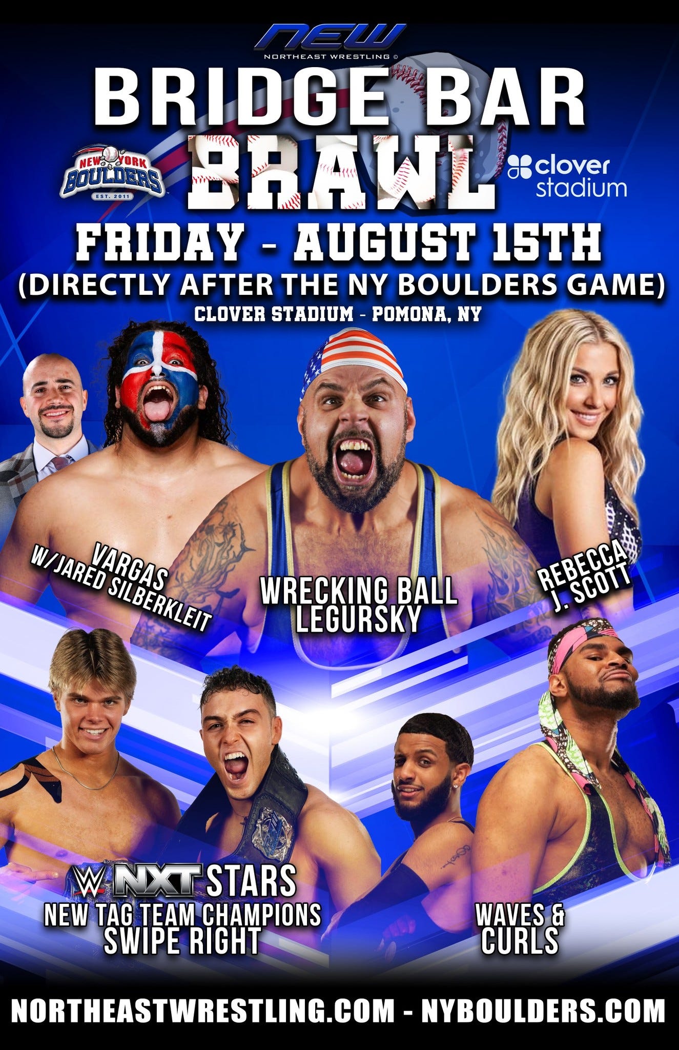 Northeast Wrestling presents Bridge Bar Brawl, a special free wrestling show in Pomona, New York, on Friday, August 15, 2025, following the New York Boulders baseball game at Clover Stadium. Tickets for the game are available online.