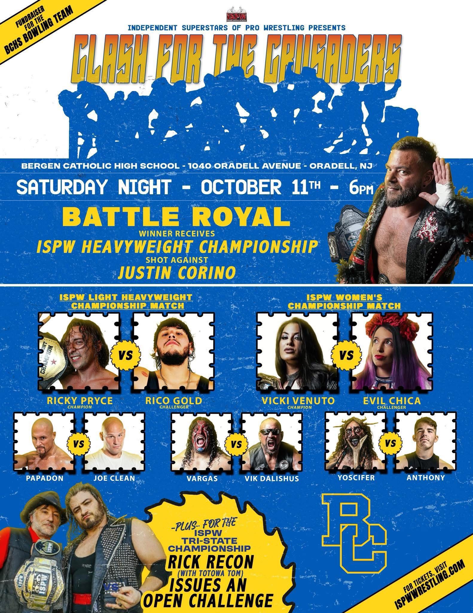 Independent Superstars of Pro Wrestling (ISPW) will present Clash for the Crusaders on Saturday, October 11, 2025, at Bergen Catholic High School, 1040 Oradell Avenue, Oradell, NJ. The bell time is 6 PM. Tickets are available online.