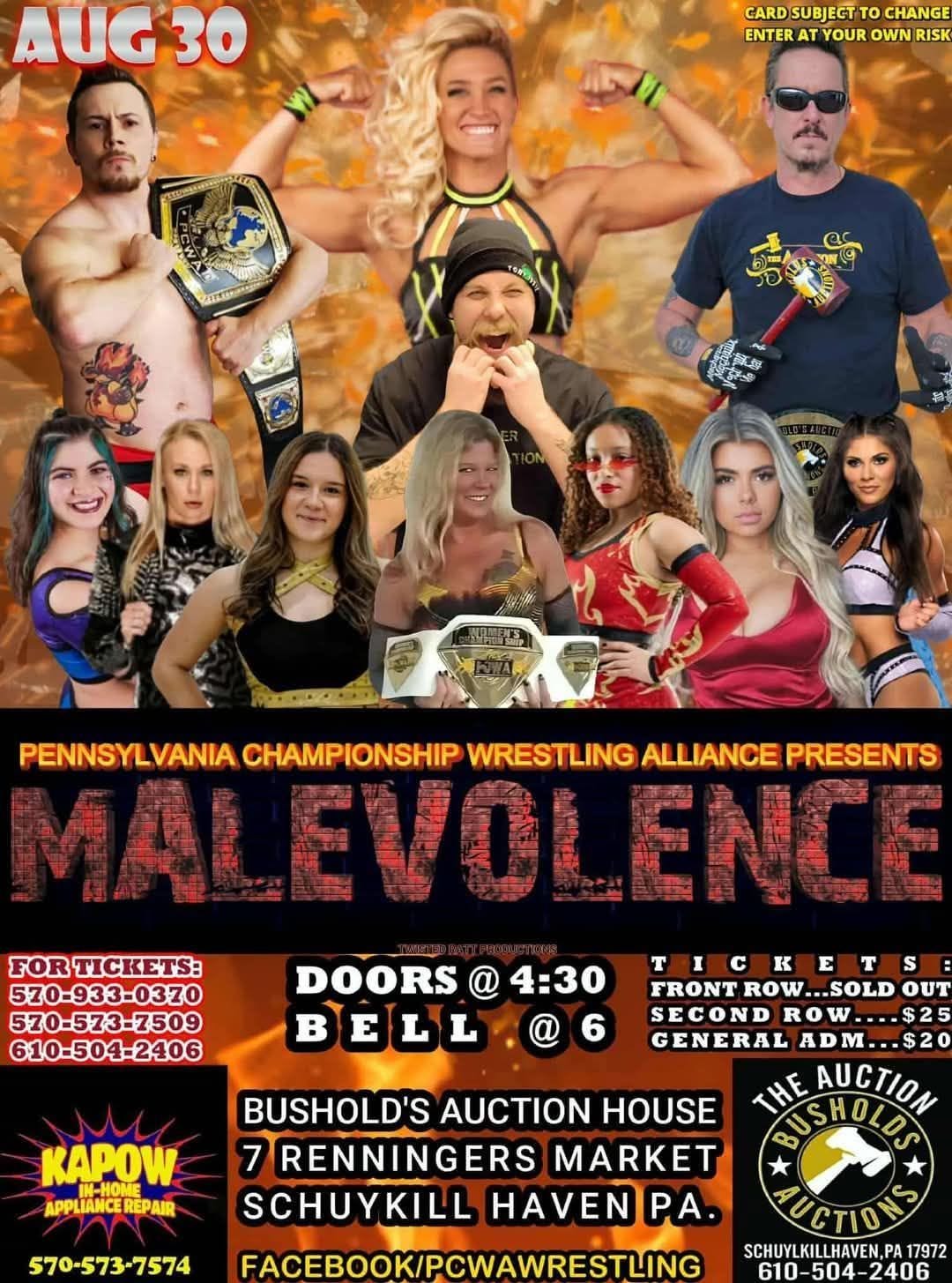 Pennsylvania Championship Wrestling Alliance (PCWA) will present Malevolence on Saturday, August 30, 2025, at Bushold’s Auction House, 7 Renningers Market in Schuylkill Haven, PA. Doors open at 4:30 p.m. and bell time is 6 p.m. Tickets are available by calling 570-933-0370, 570-573-7509, or 610-504-2406.