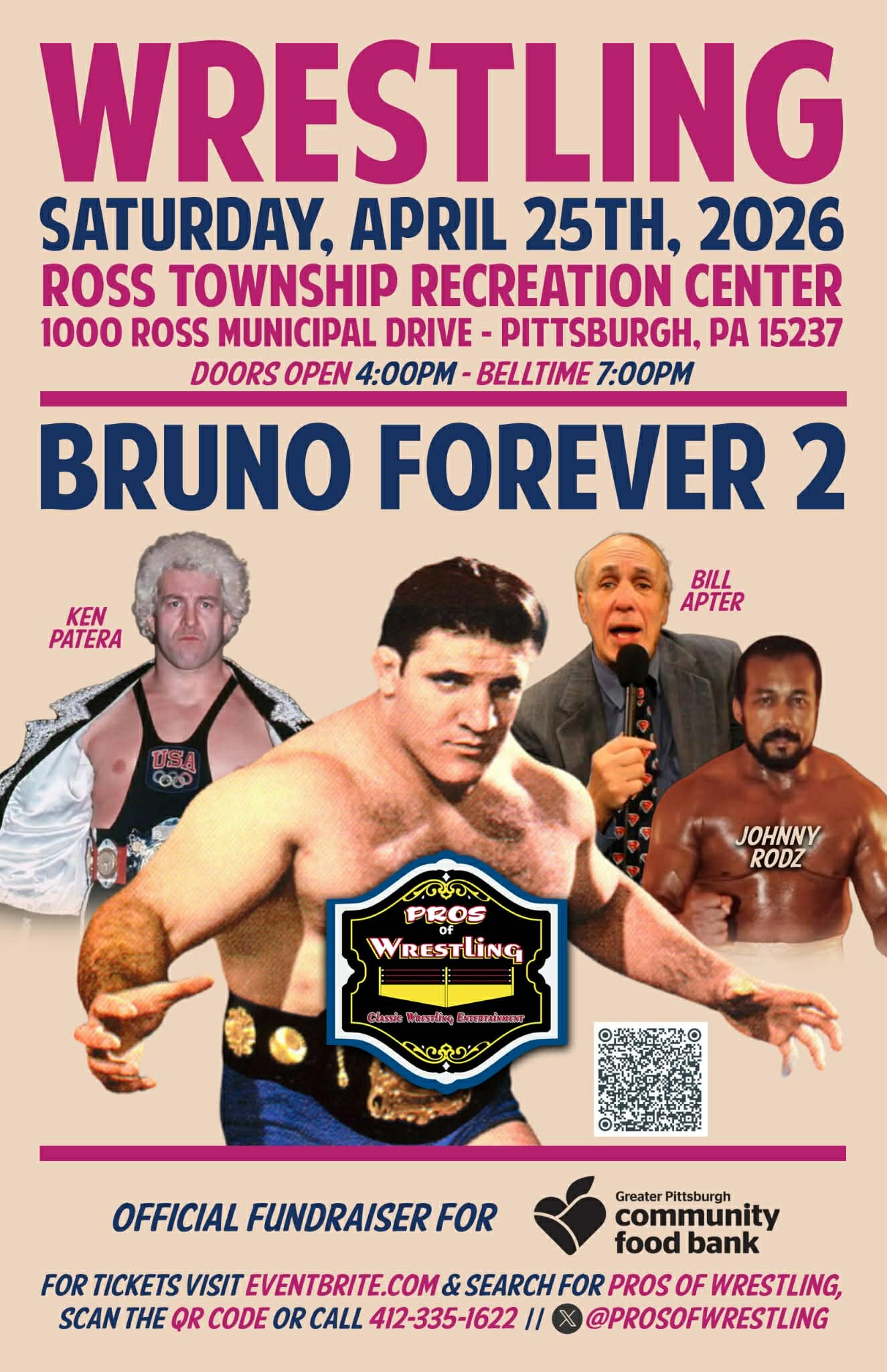 Pros of Wrestling will hold Bruno Forever 2 at Ross Township Recreation Center, 1000 Ross Municipal Drive, in Pittsburgh, Pennsylvania, on Saturday, April 25, 2026. Doors open at 4 p.m. with a meet and greet, and the bell time is scheduled for 7:30 p.m. Tickets are available online.