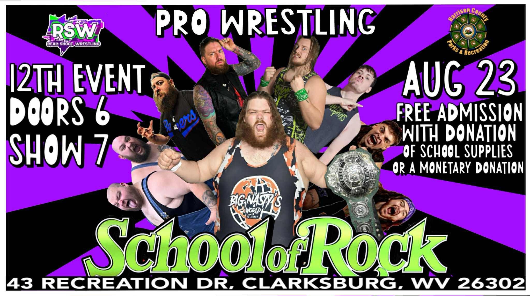 Real Shoot Wrestling (RSW) will present School of Rock on Saturday, August 23, 2025, at 43 Recreation Drive in Clarksburg, West Virginia. Doors open at 6:00 p.m. and bell time is set for 7:00 p.m. Admission is free with the donation of school supplies or a monetary contribution.