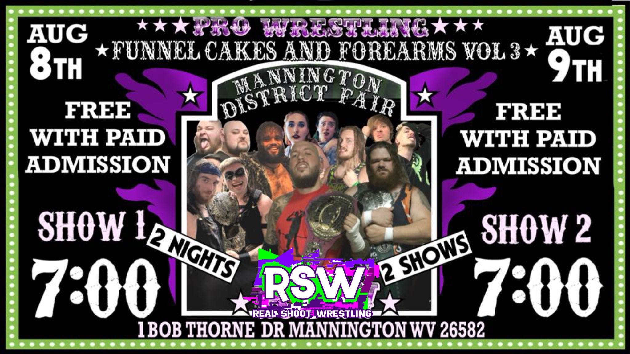 Real Shoot Wrestling returns to Mannington, West Virginia, on Friday, August 8 and Saturday, August 9, 2025, with Funnel Cakes and Forearms Vol. 3 at the Mannington District Fair (1 Bob Thorne Dr, Mannington, WV 26582). Shows are free with paid fair admission.
