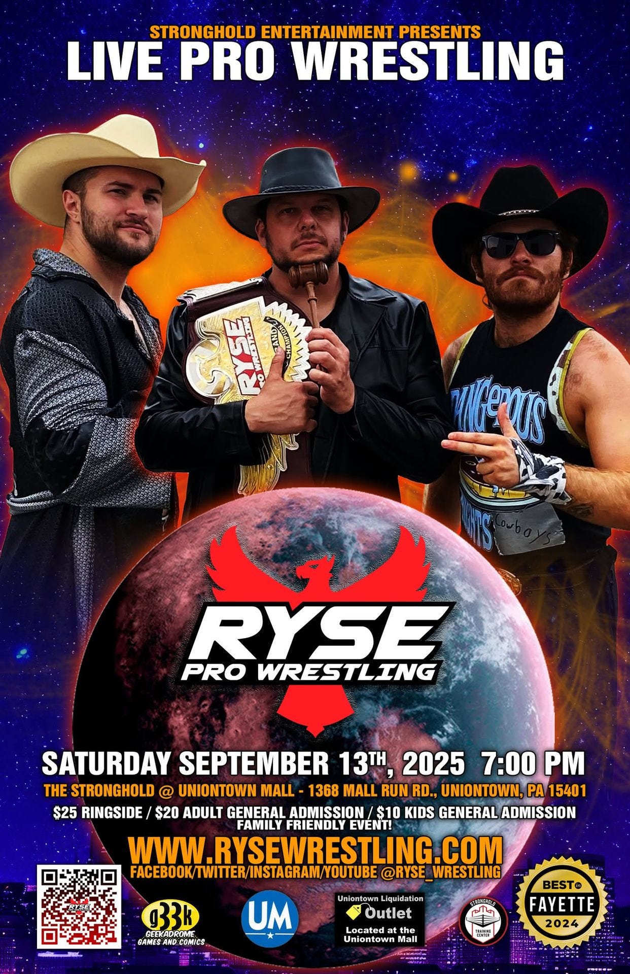 RYSE Pro Wrestling will hold an event at The Stronghold at Uniontown Mall, 1368 Mall Run Rd, Uniontown, PA, on Saturday, September 13th, 2025. Bell time is 7:00 p.m. Tickets are available online.