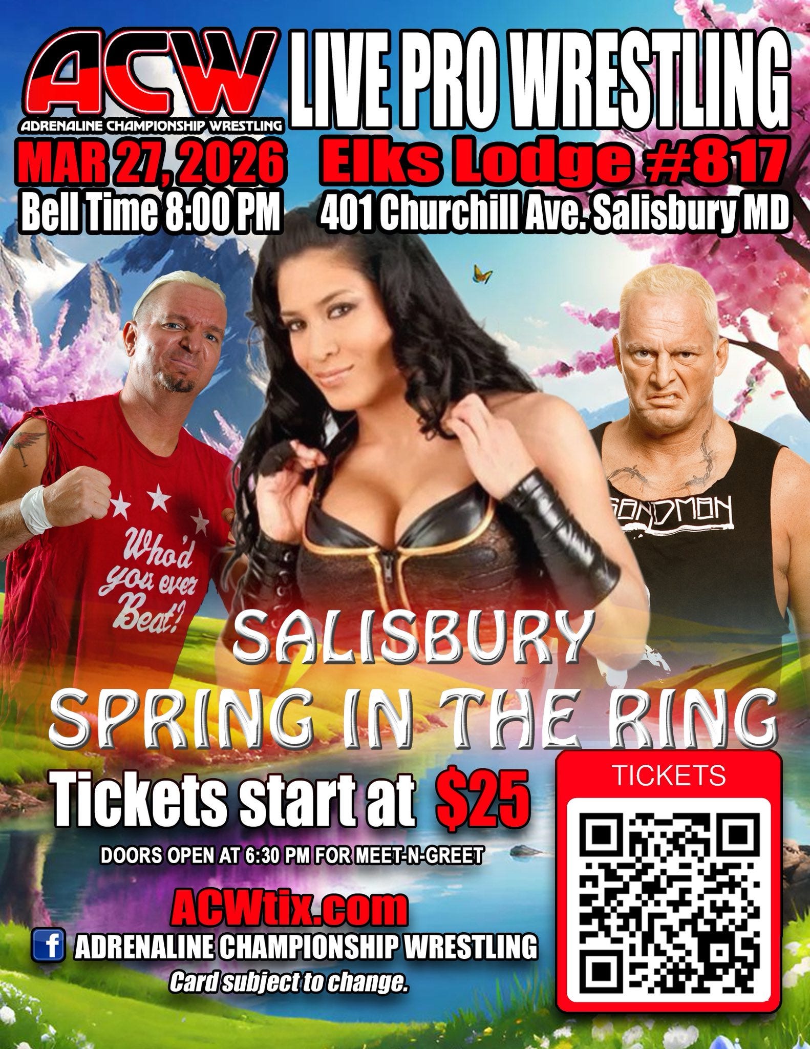 Adrenaline Championship Wrestling will hold Spring in the Ring at Elks Lodge #817, 401 Churchill Ave., in Salisbury, Maryland on Friday, March 27, 2026. The doors open at 6:30 p.m. for a meet and greet, and the bell time is 8 p.m. Tickets are available online.