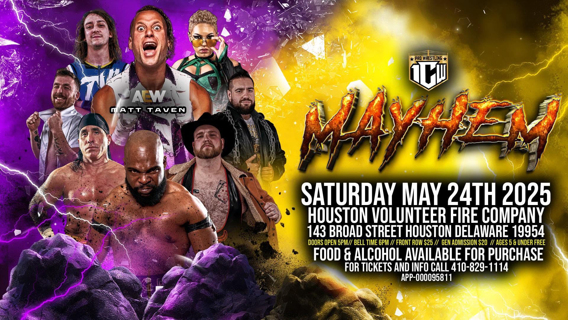 1CW Pro Wrestling presents Mayhem on Saturday, May 24, 2025, at the Houston Volunteer Fire Company, 143 Broad Street, Houston, Delaware 19954. Doors open at 5:00 p.m. and bell time is scheduled for 6:00 p.m. For tickets and info, call 410-829-1114.