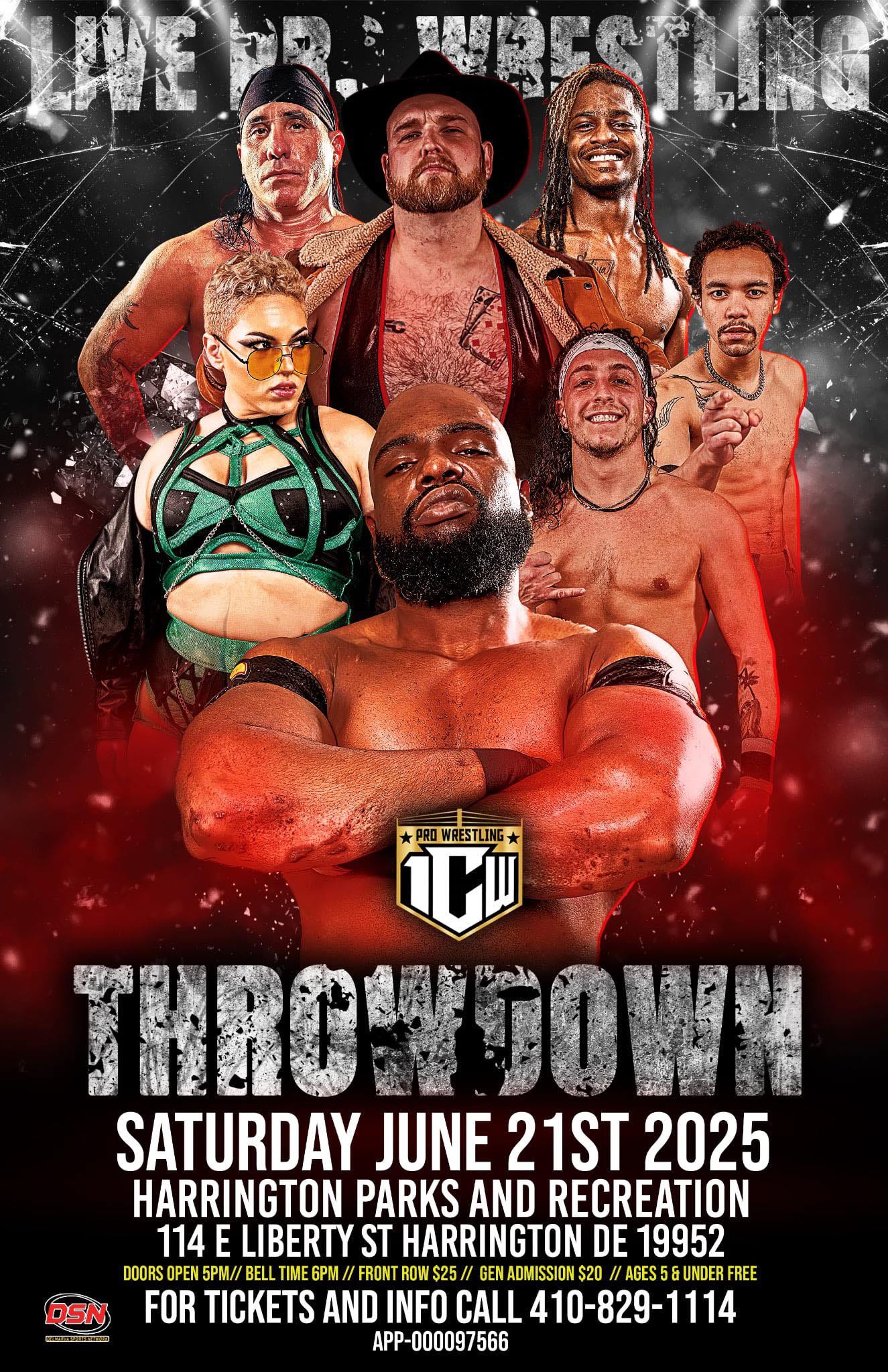 1CW Pro Wrestling presents Throwdown at the Harrington Parks and Recreation Building, located at 114 E Liberty Street, Harrington, Delaware 19952, on Saturday, June 21. Doors open at 5:00 p.m. and bell time is scheduled for 6:00 p.m. For tickets and information, call 410-829-1114.