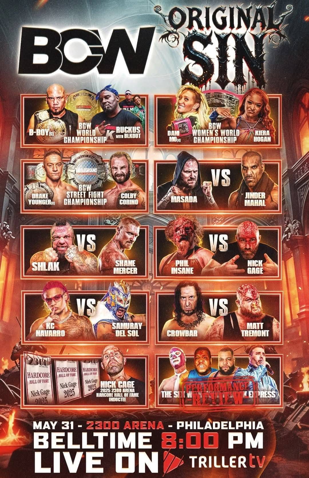 BCW presents Original Sin on Saturday, May 31, 2025, at the 2300 Arena, located at 2300 S Swanson Street, Philadelphia, Pennsylvania. A special meet and greet with the stars of Battleground Championship Wrestling will begin when doors open at 4:00 p.m. Bell time is 8:00 p.m. Tickets are available online.