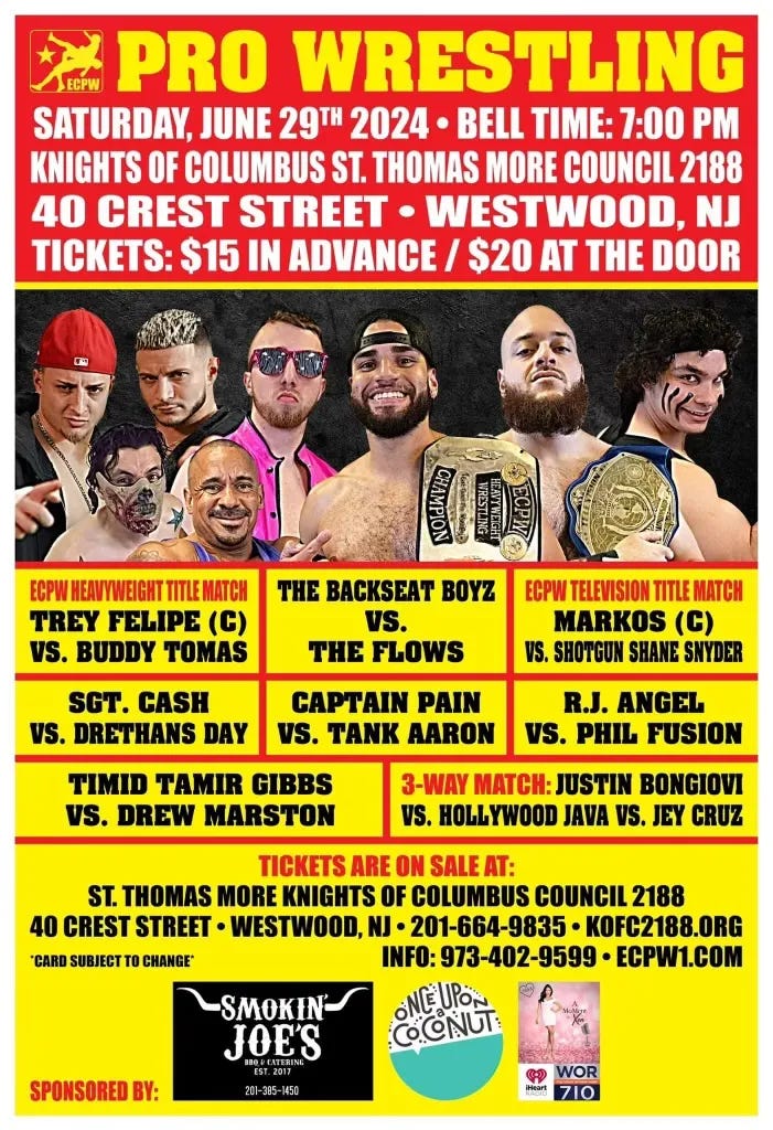 East Coast Pro Wrestling will be held on Saturday, June 29th, 2024, with bell time at 7:00 PM. The event will take place at the Knights of Columbus St. Thomas More Council 2188, located at 40 Crest Street, Westwood, NJ. Advance tickets are available online.