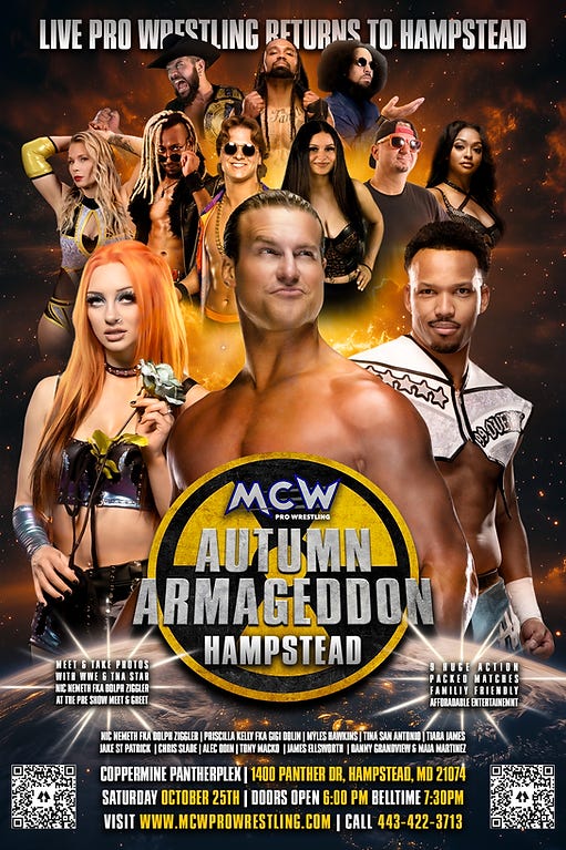 MCW Pro Wrestling presents Autumn Armageddon on Saturday, October 25, 2025, at Coppermine PantherPlex, 1400 Panther Drive in Hampstead, Maryland. Doors open at 6 p.m. and the bell time is 7:30 p.m. Tickets are available online.