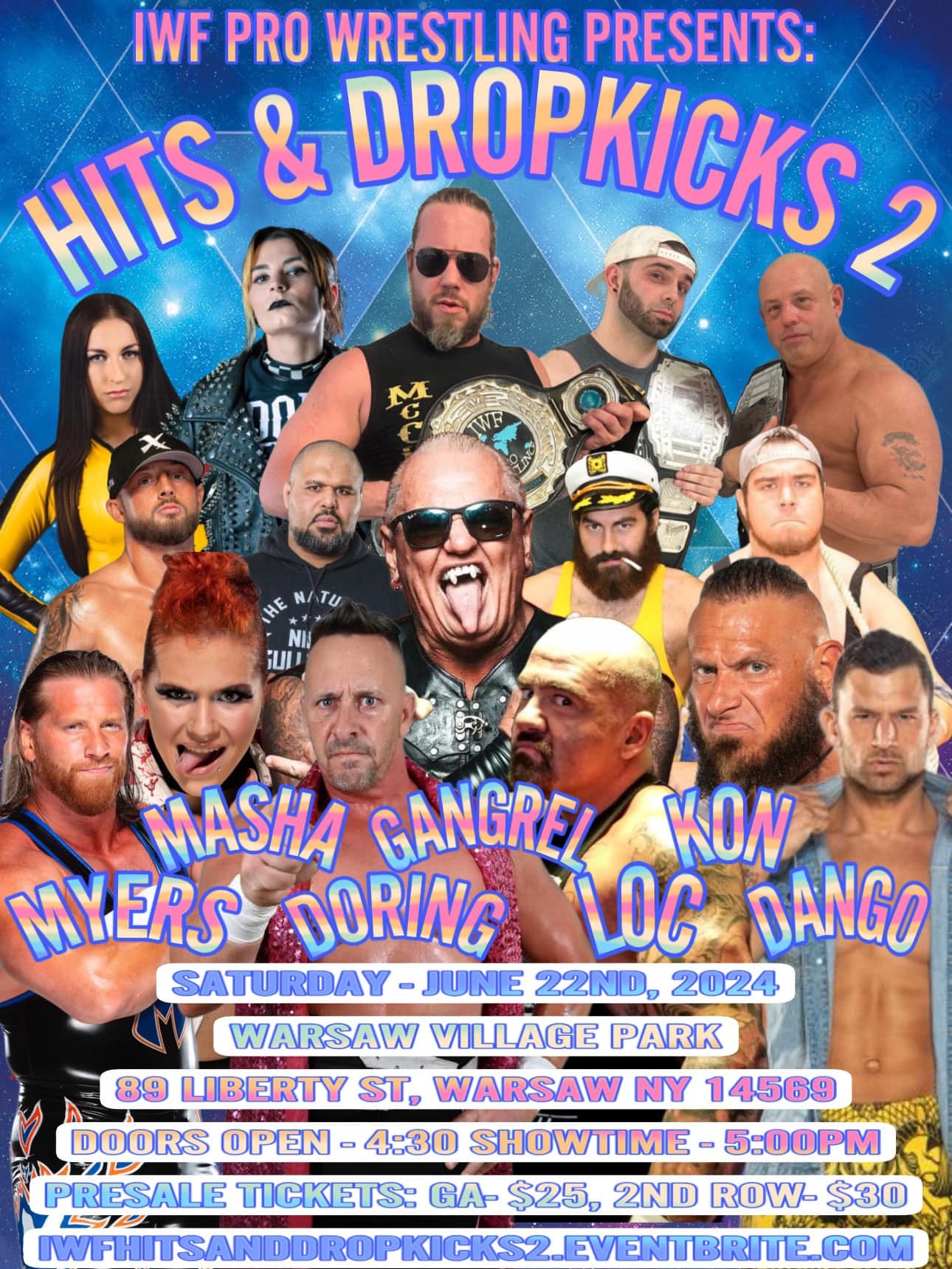 IWF Pro Wrestling returns with Hits & Dropkicks 2 on Saturday, June 22nd at Warsaw Village Park in Warsaw, NY. The event kicks off at 5:00 PM EDT. Doors open at 4:30 PM. Tickets are available online.